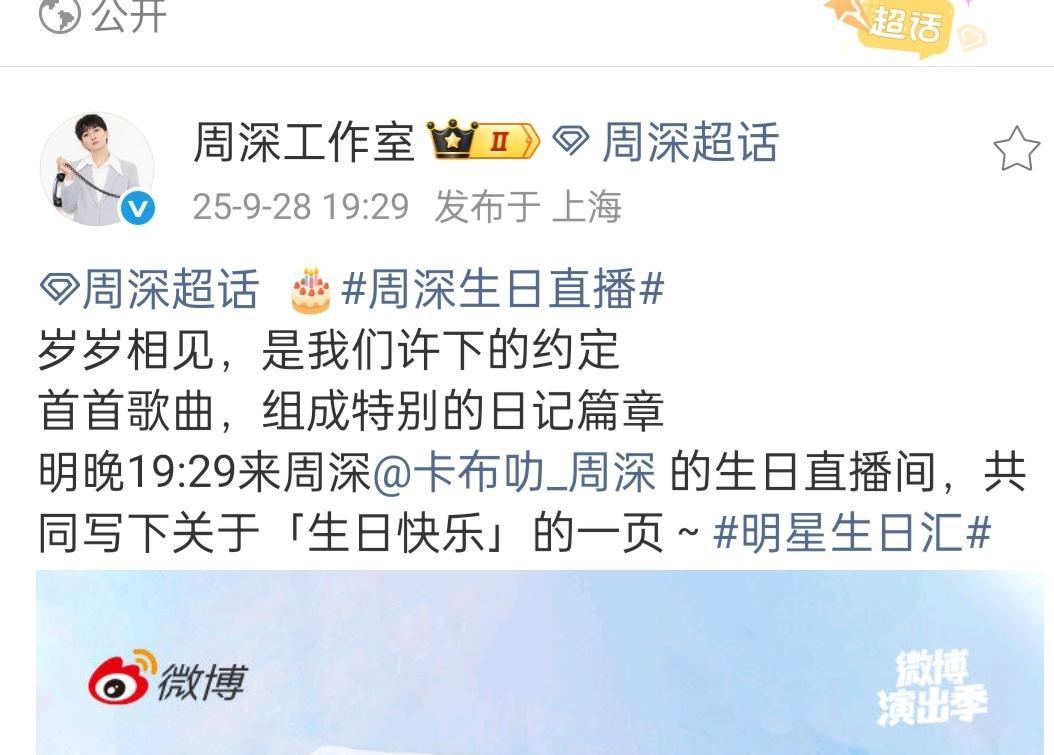 周深明天生日会直播! 太好了![小鼓掌] 今天大湾区电影音乐会,现场周深已经唱完了,已经回座位了,在第一排,直播还没到,会延迟一会儿! 岁岁相见,是我们许下的约定,是呀!每年929生日直播已经成为深米之间约定好的了! #周深#