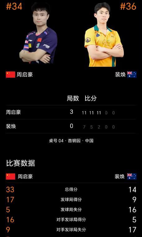 WTT中国大满贯赛事太精彩了!周启豪太猛,在男单64强赛里3 - 0横扫澳大利亚选手裴焕,轻松晋级32强。整场比赛就花了20分钟,三局比分分别是11 - 7,11 - 5,11 - 2,完全是碾压式胜利。 其实这不是周启豪第一次出彩,正赛第二个比赛日,他对阵葡萄牙名将弗雷塔斯。弗雷塔斯是欧洲杯男单冠军,此前和周启豪交手各胜一场。这次周启豪先赢两局,虽被弗雷塔斯扳回两局,但他没翻车,最终3 - 2复仇成功。接下来他要对阵阿鲁纳和林德的胜者,期待他继续带来惊喜!
