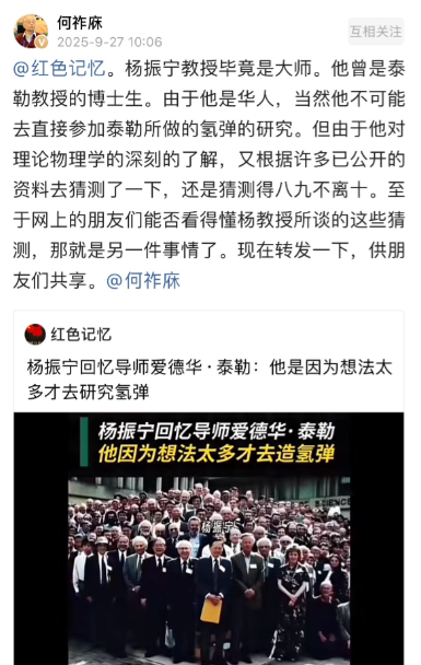 何祚庥先生给网友留言说,杨振宁教授毕竟是大师。他曾是泰勒教授的博士生。由于他是华人,当然他不可能去直接参加泰勒所做的氢弹的研究。但由于他对理论物理学的深刻的了解,又根据许多已公开的资料去猜测了一下,还是猜测得八九不离十。至于网上的朋友们能否看得懂杨教授所谈的这些猜测,那就是另一件事情了。