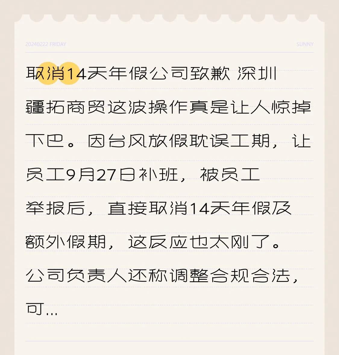 取消14天年假公司致歉深圳疆拓商贸取消14天年假后致歉,这波操作令人大跌眼镜。