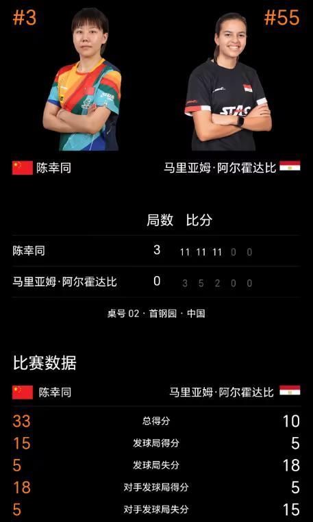 WTT中国大满贯正赛拉开帷幕,女单三号种子陈幸同迎来1/32决赛。她的对手是世界排名55位的埃及选手马里亚姆·阿尔霍达比,和排名第3的陈幸同实力差距明显。 虽赛前有人担心陈幸同大赛慢热,且没和对手交过手,但比赛中她火力全开。首局就快速进入状态,快劈长后的主动突击又连贯又有威胁,打得对手节节败退,单局打出11 - 2的降维打击。最终她直落三局3 - 0横扫对手,顺利晋级女单32强。陈幸同这状态,后续比赛值得期待!