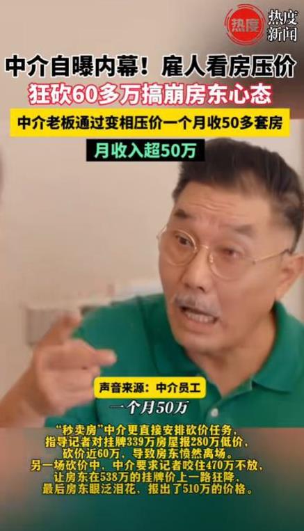 上海一房东想以339万元的价格出售房屋,不料,却被中介压到了280万元,砍价近60万元,导致房东愤然离场,事后才知道这都是中介的“套路”,中介花钱雇人来看房子,通过变相压价一个月收50多套房,月收入超50万元,网友:买家卖家两头坑! 原来,这位房东本想着按合理价格将房子出售,可中介的出现让事情变得复杂。中介先是带来一群看房的人,这些人看似普通购房者,对房子各种询问、打量。 但很快,房东发现这些人的关注点很奇怪,他们不关心房子的户型、采光等常规问题,反而一味挑刺,还联合起来压低价格。原本定价339万的房子,被生生压到了280万,砍价幅度近60万。房东又惊又气,觉得这价格远低于心理预期,愤然离场。 事后,房东越想越不对劲,经过一番了解才惊觉,这一切都是中介精心设计的“套路”。原来,中介为了获取高额收入,采取了一种极为不道德的手段。他们花钱雇人来看房子,这些“演员”伪装成购房者,在中介的授意下,故意压低房东的报价。 中介这么做有着不可告人的目的。在房产交易市场,中介往往掌握着大量房源信息,他们利用房东急于卖房的心理,先通过雇人压价,让房东觉得房子难卖,不得不降低价格预期。 一旦房东妥协降价,中介就能以较低价格拿下房源,随后再以市场合理价格甚至更高价格卖出,从中赚取巨额差价。 而且,这种手段并非个例。据了解,该中介通过这种变相压价的方式,一个月内就收下了50多套房。每套房通过压价再转手卖出,利润空间巨大,中介月收入超50万元。这背后,是中介对市场规则的肆意践踏和对房东、购房者权益的严重侵害。 从房东角度看,他们本想通过中介快速、合理地出售房屋,却没想到陷入中介设下的陷阱,遭受重大经济损失。而对于真正的购房者来说,这种中介行为也扰乱了市场秩序。原本可能以合理价格买到心仪房子的购房者,因为中介的恶意压价和抬价,要么面临房价虚高,要么错失合适的房源。 这种“两头坑”的行为,暴露了当前房产中介市场存在的监管漏洞。中介作为房产交易的重要桥梁,本应秉持公正、诚信的原则,为买卖双方提供专业服务。但部分不良中介为了追求高额利润,不惜采用欺诈、压价等手段,破坏市场公平。 在房产交易中,房东和购房者往往处于信息不对称的弱势地位。房东可能不了解市场真实行情,容易被中介误导;购房者也可能因为信息不透明,无法准确判断房价合理性。这就需要相关部门加强监管,规范中介行为,建立透明的房产交易信息平台,让市场价格更加公开、公正。 对于广大民众来说,在进行房产交易时,一定要提高警惕。房东在定价前要多了解市场行情,不要轻易被中介的压价行为所左右;购房者也要仔细甄别房价合理性,避免被不良中介欺骗。 上海这位房东的遭遇给所有人都敲响了警钟。希望这样的事件不再发生,让房产市场回归公平、公正的轨道。大家在房产交易中是否也遇到过类似的不良中介行为呢?欢迎在评论区分享自己的经历。