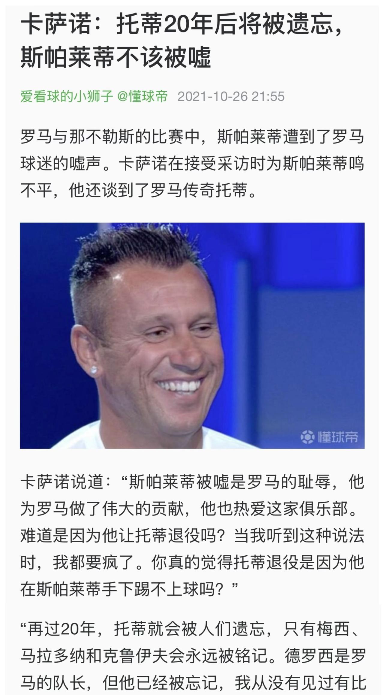 意大利名宿、罗马狼王托蒂在接受采访时表示,父亲的去世和妻子的背叛对他产生了非常大的打击,他在和抑郁症作斗争。 所以,这就是他质疑“如果把梅西放在罗马25年,还能拿这么多金球奖吗”的理由了? 抱歉,我刚知道托蒂这些事儿,但我同情不起来。 真有抑郁症,就老老实实接受治疗摆脱病症,而不是接受采质疑别人。