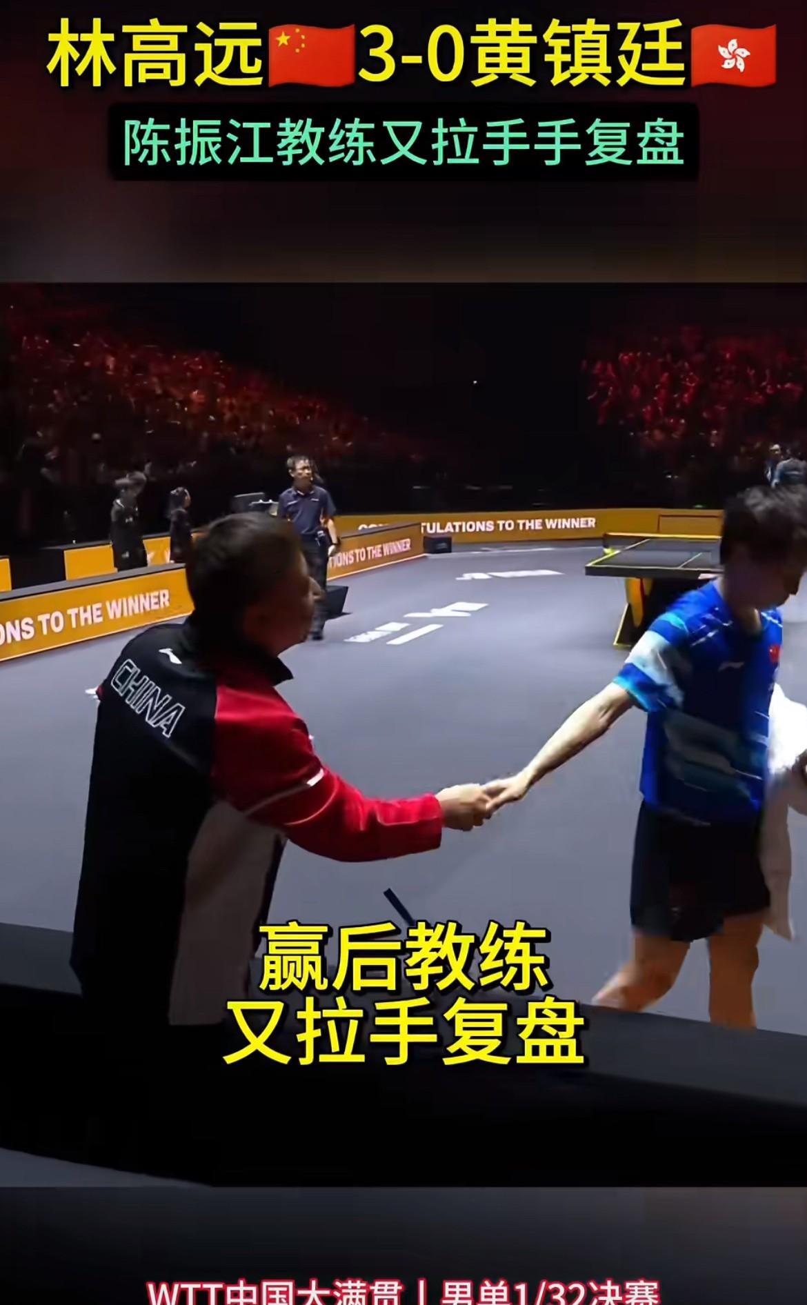恭喜林高远开门红!下场继续加油!谢谢振江教练! 林高远3-0横扫黄镇廷,顺利闯进男单下一轮。赛场上他一点不怵,先发制人把节奏死死拿捏住,让黄镇廷压根没多少反击机会。三局比分拉开不少,状态那叫一个好。正赛首轮就打出这水平,后面比赛更让人期待了。 现场球迷的加油声也很给力,虽然没有专属粉丝团,这氛围也把他往前推。教练陈振江在旁边看得热血沸腾,那激动劲儿就是对他表现的认可,林高远肯定更有信心了。 比赛结束后师徒俩的互动也很有默契,陈指导的兴奋是真的,看得出来林高远也是受到鼓励了。恭喜我们小林将军开门红,健康完赛,尽情享受赛场,下场继续加油!