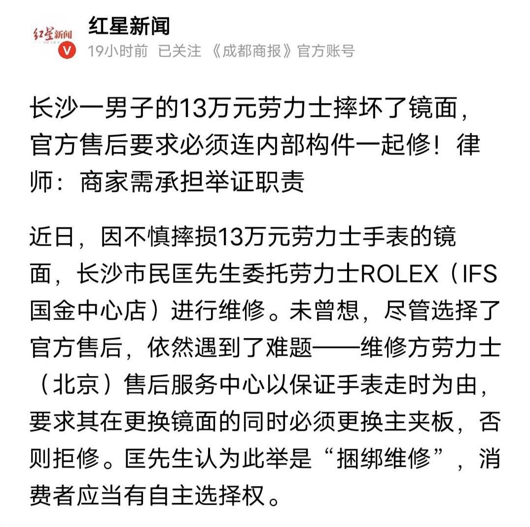 湖南长沙,男子13万的劳力士手表摔坏了镜面,拿去门店维修,预计费用5900元,仅过3天,门店说除了换镜面还要换主夹板,需要12300元,男子惊讶:手表内部没坏,为啥要更换主夹板?他不同意“捆绑维修”,门店表示:如果不换主夹板,会将手表退回。男子要求更换新手表,门店给出一新方案,男子仍无法接受。 2018年5月1日,匡先生在香港买了一块劳力士手表,花了13万,他一直戴着爱不释手。 然而,一次不小心手表摔落,镜面被摔坏了,看着破损的镜面,匡先生心疼不已,他简单清理一下后,在2025年8月31号,拿着手表委托一家门店将手表送去维修。 在手表还没送去之前,门店告诉匡先生,大概费用需要5900元,包括完整检修(不抛光)3800元,更换镜面1100元,更换表冠1000元。并注明代送至服务中心,维修发票由某公司表行开出。 可没想到,门店工作人员陈女士和匡先生说,服务中心检测后,因为手表在第三方开过盖,主夹板有胶块和损坏痕迹。 所以,匡先生这块手表除了要换镜面,还得换主夹板,费用得重新算了。 之前有3800元的检修服务,更换镜面要1200元,主夹板要7300元,一共是12300元。 匡先生十分疑惑,惊讶的说:“我的手表内部没有损坏,为什么要修主夹板?” 他怀疑维修中心没有经过他同意,就把表拆了。 陈女士立马解释,如果匡先生没有确认服务,维修中心是不会开始修手表的。 这种解释没有打消匡先生的疑虑,他觉得自己陷入了“捆绑维修”。 陈女士也对为什么要更换主夹板进行了解释,意思就是,这个主夹板不换,会影响手表的稳定性和精准度,以及会影响机芯后续的走时,不过她还说,维修中心拿不出损坏位置的视频。 9月8号,陈女士给匡先生打电话,说服务中心催着处理,要是匡先生当天不确认服务,第二天会把手表退回来。 匡先生不认可这一处理方法,他认为商家不能以走时为由,强制他进行不必要的维修。 一转眼,到了9月22号,手表送修过去了15个工作日,但手表还没有修好。 匡先生问门店,啥时候能修好? 陈女士说,因为匡先生不同意更换主夹板,他们还在和服务中心对接。 匡先生非常生气,这不是“不该修的乱修”嘛!而且,对方没有按照约定时间主动处理,简直是对消费者的漠视。 9月23号,匡先生和记者来到门店再次协商,结果沟通一个小时也没谈妥,匡先生干脆提出新要求——更换一块新手表。 9月24号,门店提出一个新的方案,可以免费给更换主夹板。 不过,匡先生还是怀疑,手表主夹板本就是好的,如果,维修中心没有更换,却以“免费更换”为名处理,本质仍是忽悠消费者。 因此,匡先生拒绝了这一方案。 9月26日,记者又咨询了维修中心能不能提供损坏零部件的视频或者图片时,对方工作人员说没有这个服务。 工作人员表示,手表送来也不是当着消费者面拆开,顾客看不到,价格是口头告知,修好后会给清单。 匡先生也是很无奈,他很被动,无法了解手表的真实情况。 这场纷争中,匡先生认为,自己有权决定维修哪些零部件,他要求只更换镜面,不需要更换主夹板。 门店表示,维修需要确保手表完全修好,走时无误,因此要按照要求完成所有必要维修项目,否则不予维修。 双方因为这件事一直协商未果…… 接下来从法律方面分析一下这件事: 第一,商家在没充分和匡先生沟通并取得同意的情况下,要求更换主夹板,侵犯了匡先生的知情权。 《消费者权益保护法》第8条规定:消费者享有知悉其购买、使用的商品或者接受的服务的真实情况的权利。 商家在没有和匡先生充分沟通并得到他同意,就要求他更换主夹板,明显侵犯了他的知情权。 因为,匡先生没有在第一时间了解到手表真实检测情况和维修必要性。 同时,匡先生作为消费者有权决定是否更换主夹板,而不是被商家单方面要求。 第二,商家仅口头说明手表主夹板有损坏,却拿不出视频或者图片等直观证据来证明。 《民事诉讼法》第64条规定:当事人对自己提出的主张,有责任提供证据。 所以,商家不能只凭自己一面之词就要求匡先生承担更换主夹板的费用。 对于没有有效证据支撑的要求,匡先生作为消费者有权要求商家提供充分、可靠的证据来支持其维修主张。 第三,在这个事件里,商家坚持必须更换主夹板,理由是不换会影响走时。 但如果实际上更换镜面后,手表走时正常,那就说明商家当初强制要求更换主夹板没有合理依据。 匡先生担心商家利用消费者对专业知识的缺乏,以不合理的理由迫使消费者接受额外的维修服务,从而获取更多利益。 有人说,本来是站顾客这一边的,看到诉求要换新表时,内心的鄙视就冒起来了。到店家免费换夹板这一步。我觉得就可以了,皆大欢喜,这表顾客本来就在外面私修过。 你怎么看呢? 关注@福康说法 从日常点滴学法律,生活安稳更有底 #万能生活指南#
