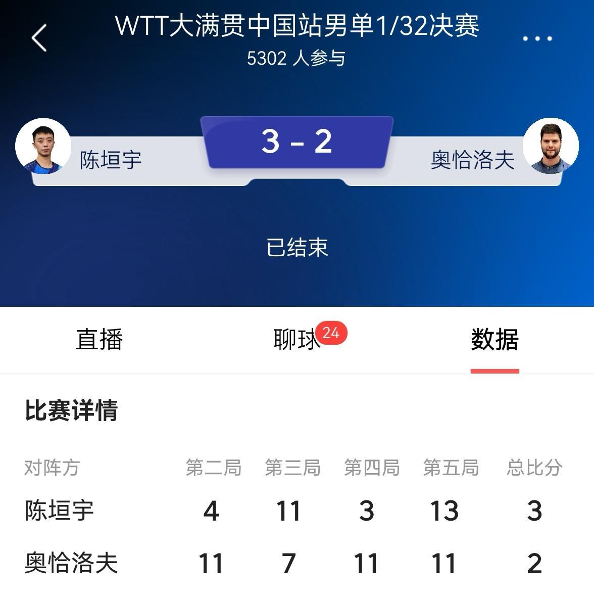 中国男乒小将陈垣宇赢得太惊险了!在今天结束的一场世乒联大满贯赛中国站男单第一轮中,20岁的小将陈垣宇苦战五局,最终以3:2险胜德国老将奥恰洛夫,艰难晋级下一轮。 我相信本场比赛的获胜对于年轻的陈垣宇来说意义重大,他的心理素质应该会得到一定程度的提高,期待陈垣宇能够在接下来的比赛中打出更加精彩稳定的表现。