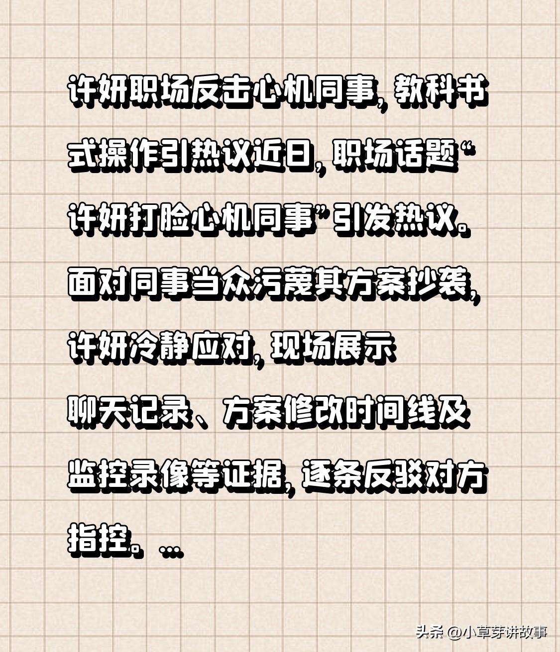 惊爆!许妍职场智斗心机同事,教科书式反击引关注 近日,“许妍打脸心机同事”这一职