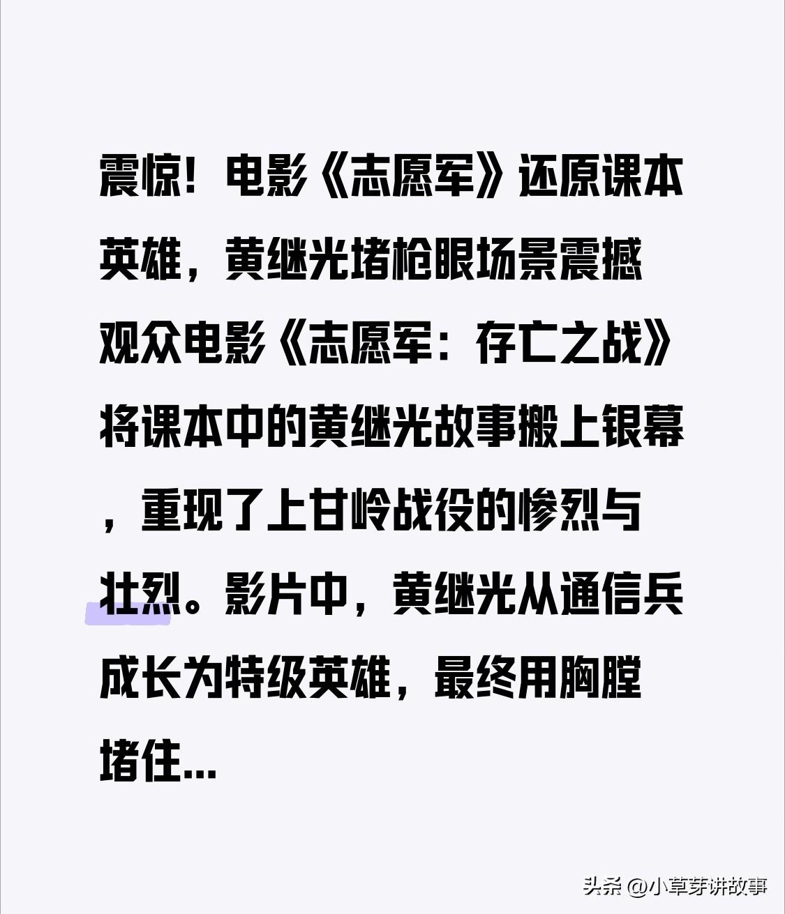 震惊!电影《志愿军》再现课本英雄,黄继光堵枪眼场面震撼人心 《志愿军:存亡之战》把课本里黄继光的故事搬上银幕,重现上甘岭战役惨烈。片中,黄继光从通信兵成长为特级英雄,用胸膛堵枪眼一幕令观众动容。导演陈凯歌以炮弹轰炸、山头削低画面还原战争残酷,让观众明白和平是英雄用生命换来的。