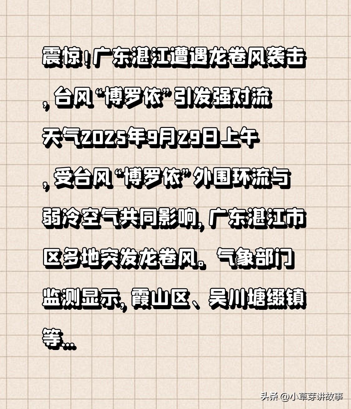 惊!广东湛江遭龙卷风袭击,台风“博罗依”诱发强对流天气 2025年9月29日上午,受台风“博罗依”外围环流和弱冷空气共同作用,湛江市区多地突现龙卷风。气象监测显示,霞山区、吴川塘缀镇等地有明显龙卷风迹象,云柱自海面席卷,狂风暴雨相伴。当地台紧急预警,提醒防风差建筑内人员撤离。“博罗依”已致越南3死21失踪,灾害影响扩大。