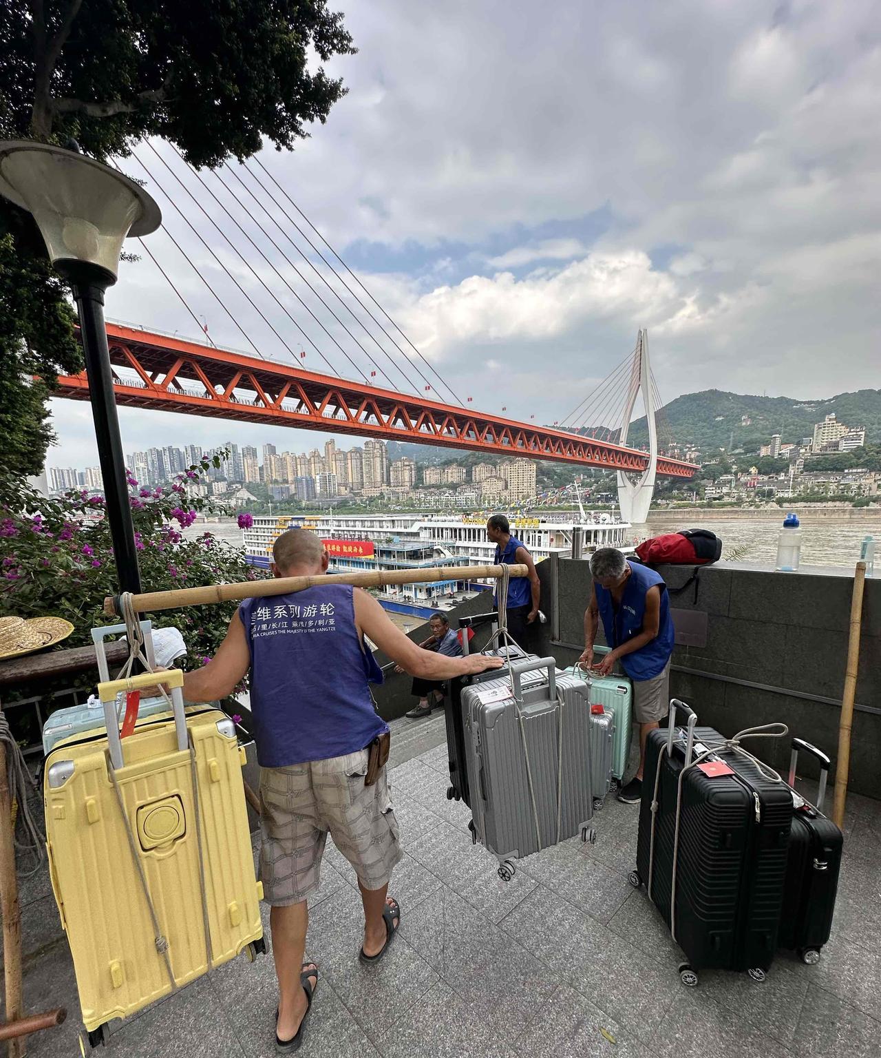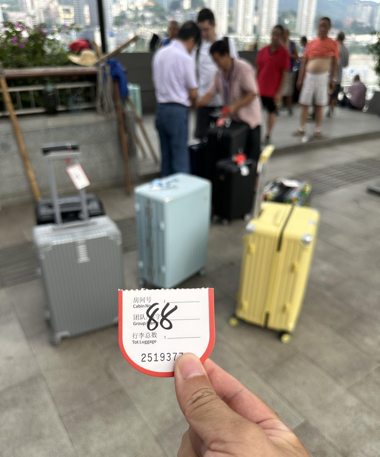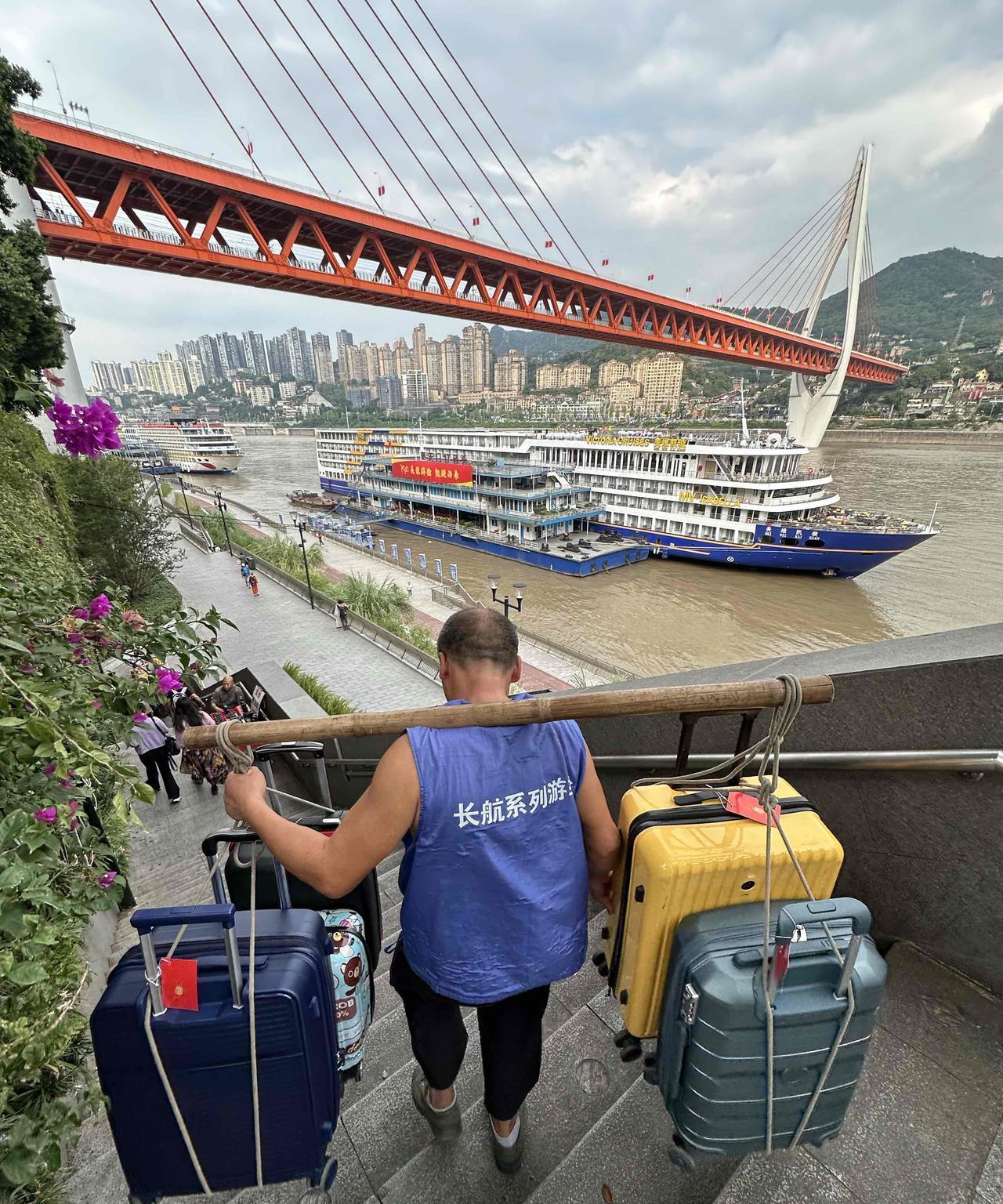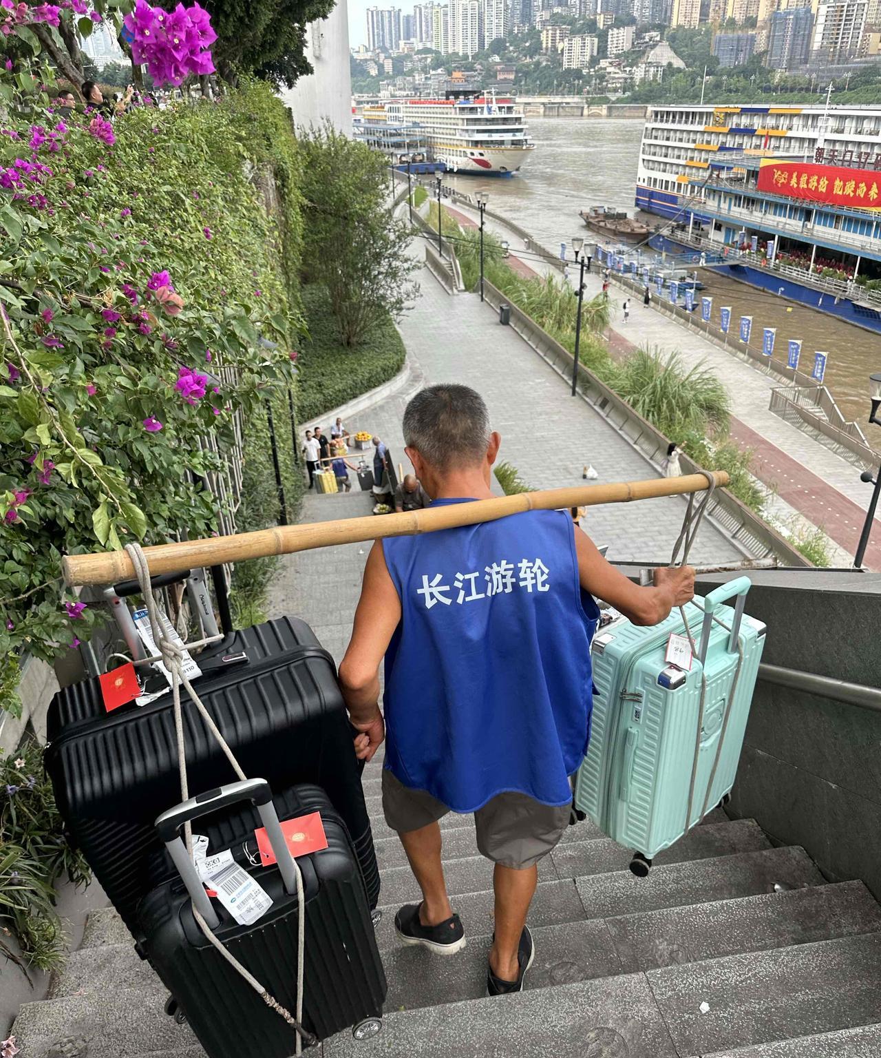 五星级豪华游轮,美维凯璇号,乘客是不用自己辛苦搬行李的,因为船方请了很多重庆棒棒