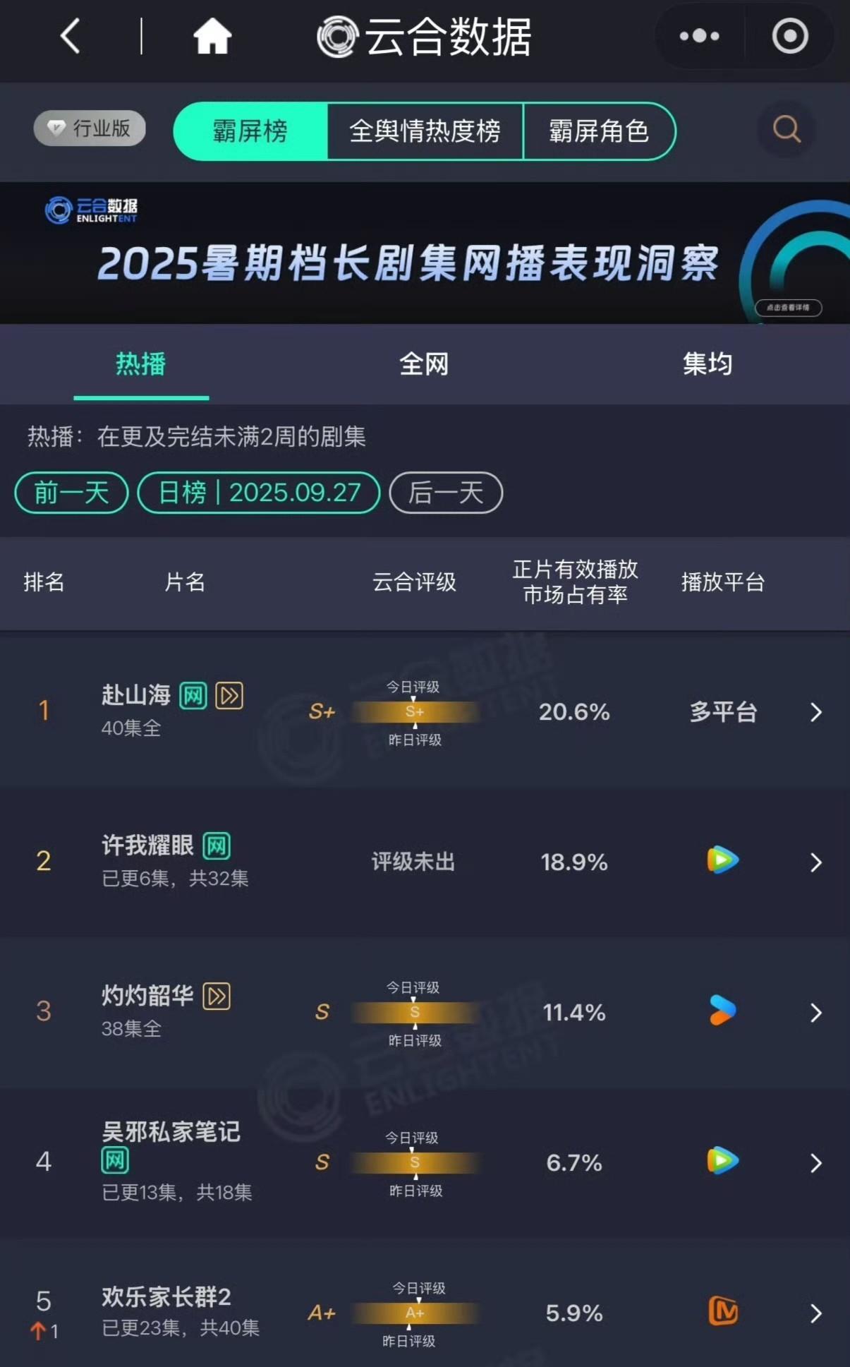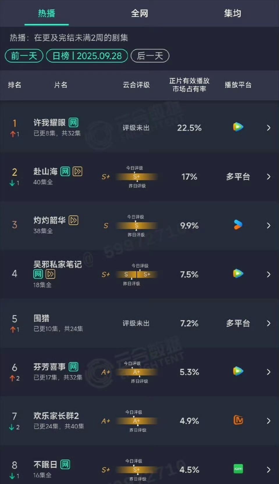 《许我耀眼》播的不错,开播第三日云合登顶! 开播日占比12.7%,算是爆开,次日