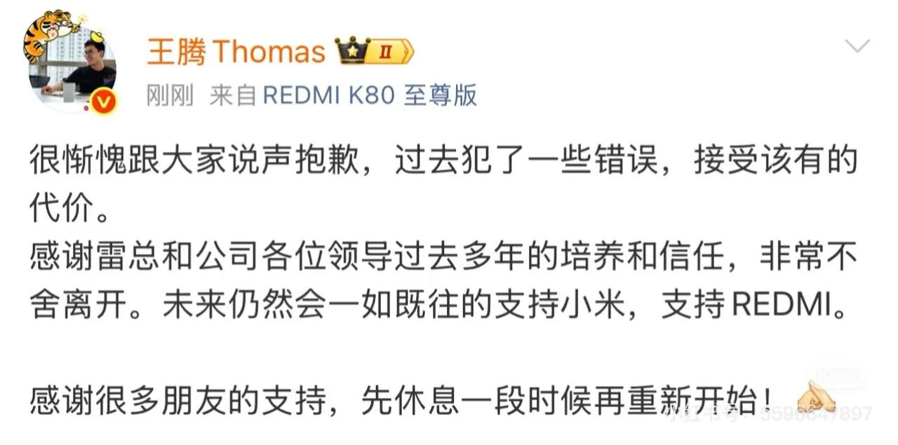 王腾居然被小米辞退了! 一早上起来看见这个新闻的时候我还以为是谁在恶搞呢! 可是仔细看之后才发现这个新闻是真的!一时间网上各种小道消息漫天飞舞! 有的人说王腾之所以被小米辞退是因为王腾将小米的额保密信息售卖! 有人说王腾被小米辞退是因为王腾是单纯的泄密,无心之失,但是依然给小米造成了巨大损失所以才只是辞退而么有提起刑事诉讼! 王腾也在微博上给出回应,自己之所以被辞退是因为犯了一些错误,绝对没有出卖公司的利益!至于对泄密方面的事情绝口不提! 所以网上传的小米内部通告王腾因为泄密出售资料的图片应该是假的! 不过网络上这种自证清白的事情翻车的事情从来不少! 要知道最近小米马上要发布新手机上市,在这个敏感环节王腾被辞退了,肯定对新手机有重大影响的,虽然小米王化说曾经对王腾有过单独保密,毕竟王腾曾经的身份在那里! 咱们还是让子弹飞一会吧,看王腾一个月之内如何。要知道王腾这样的人肯定有竞业协议的!