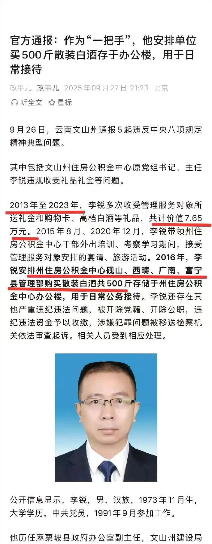10年通过各种方式贪没了7.65万元赃款,还是一个单位的“一把手”,正处级,网友们看到这个信息破防了,这真是一个大贪官。 公开信息显示,云南文山州住房公积金中心原党委书记、主任李锐,2013-2023年间,他多次收受礼金、购物卡、高档白酒等礼品,共计价值7.65万元,甚至,安排购买散装白酒共500斤储存于公积金办公楼,用于日常公务接待,国家的打击力度是相当的大,果然是老虎和苍蝇一起拍。 李锐贪腐信息一出,网上一片沸腾,有喊好的,有喊屈的,甚至,还有人质疑数字是否存在遗漏等等,总之,网友们更在意的是李锐一个“一把手”贪腐的数字,你一个大领导10年时间贪腐7.65万元,该说你奸,还是说你精明?你是故意细水长流吗? 不要存在侥幸心理,即便用10年时间抠苍蝇肉似的贪钱,李锐也是贪腐,必须严惩,这真是振奋人心的事情,我想看评论区,欢迎评论区留下你的观点。