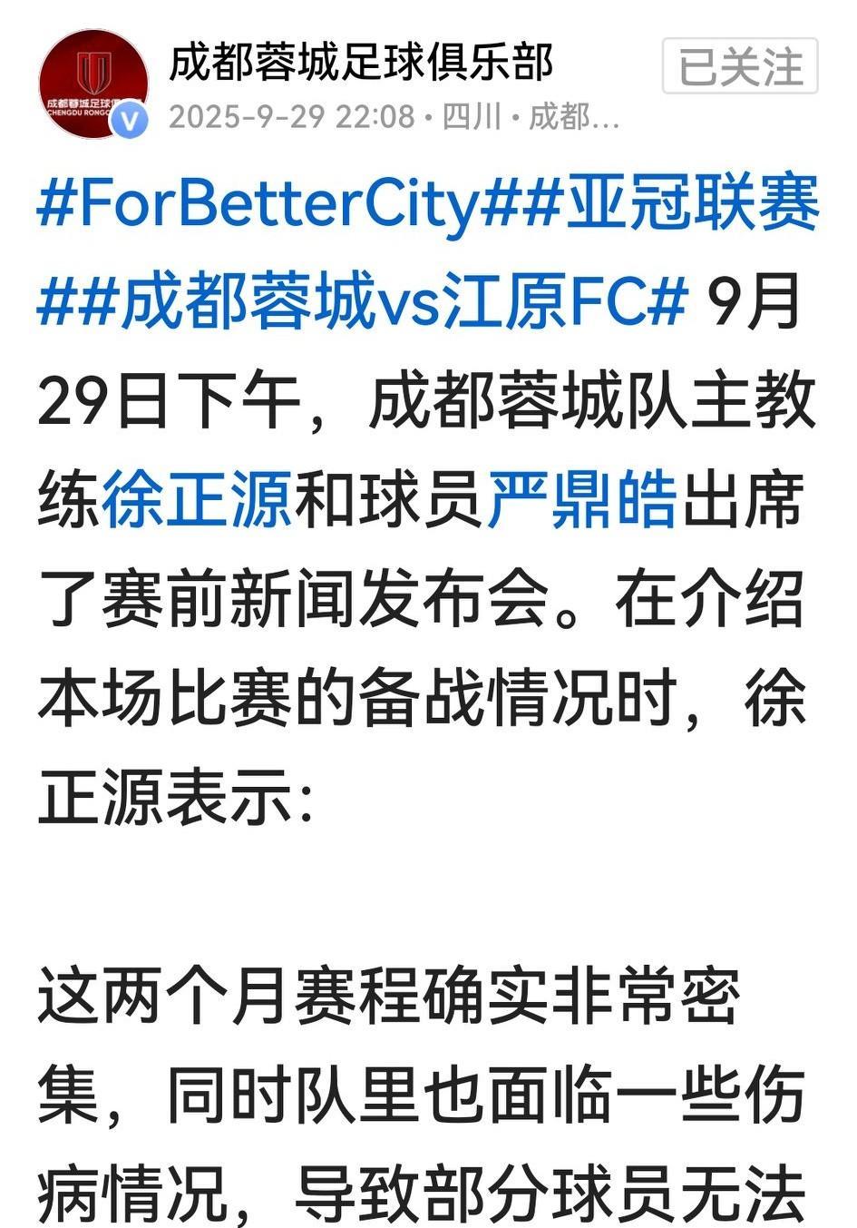 面对部分成都球迷喊对亚冠放手,徐正源明确表示“既要又要”,绝不撒手。 在对阵江源FC的赛前发布会上老徐说,重视联赛但不放弃亚冠,虽有伤病但不是借口,明天要展现固有的特点与风格,要打出一贯的决心和意志品质。这意味着蓉城将尽遣主力,力争拿下对手。 也是,申花以第二阵容检验了江源的成色,从1:2的结果来看,日韩球队中江源的实力相对较弱。若蓉城在主场都赢不下江源,征战亚冠恐难有出路。所以,既然老徐做了选择,球员当全力以赴,球迷当鼎力支持。 同样,江源主帅也是拿申蓉之战作参照物,从防守到定位球、甚至城市风貌等多角度捧杀蓉城,老徐及队员可得从客战申花以及申花客战江源中吸取经验教训,以我为主,以硬碰硬,开启蓉城亚冠进球、拿分、胜利的历史。