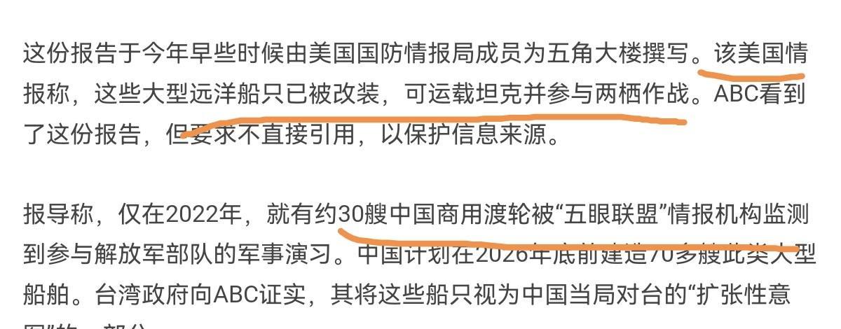 美国情报部门突然发布报告称,中国正在迅速扩充滚装船队,为武统台湾做准备。9月29日,根据法新社报道,一份美国机密军事情报报告指出,中国正在迅速扩充其商业渡轮船队,一些大型远洋船只已被改装,可运载坦克并参与两栖作战。仅在2022年,就有约30艘中国商用渡轮被监测到参与解放军部队的军事演习。而中国计划在2026年底前建造70多艘此类大型船舶。 法媒则称,被评估为新型“登陆驳船”——能够将部队和车辆部署到海滩的驳船。三月份拍摄的图像显示,中国的渡轮停泊在“登陆驳船”旁边。很显然,美国情报部门据此得出结论称,中国正在为武统台湾做准备。对于美国情报部门的结论我们怎么看呢?说实话,我们在为解决台湾问题在进行各方面的准备,这完全可能。 从我们的角度而言,美国一直把“台湾牌”当作是遏制我们的棋子,而民进党当局死不悔改,仍旧继续谋独。在这样的背景下,我们当然要进行各种准备,以防非常之变的发生。不过,必须挑明的是,我们做武力的准备,最本质的原因有二。其一,毫无疑问,武力是我们解决台湾问题最坚实的后盾。 其二,我们要谨防“台独”分子狗急跳墙。我们有最大的诚意和善意以和平的方式解决台湾问题,但对于当下局势,我们不会心存幻想。很显然,以武力作为后盾,这是我们对“台独”分子和域外势力打的明牌。台湾的局势牢牢的掌控在我们手中,这不是一句空话,任何心存歹念的势力都不要对此有任何的误判。
