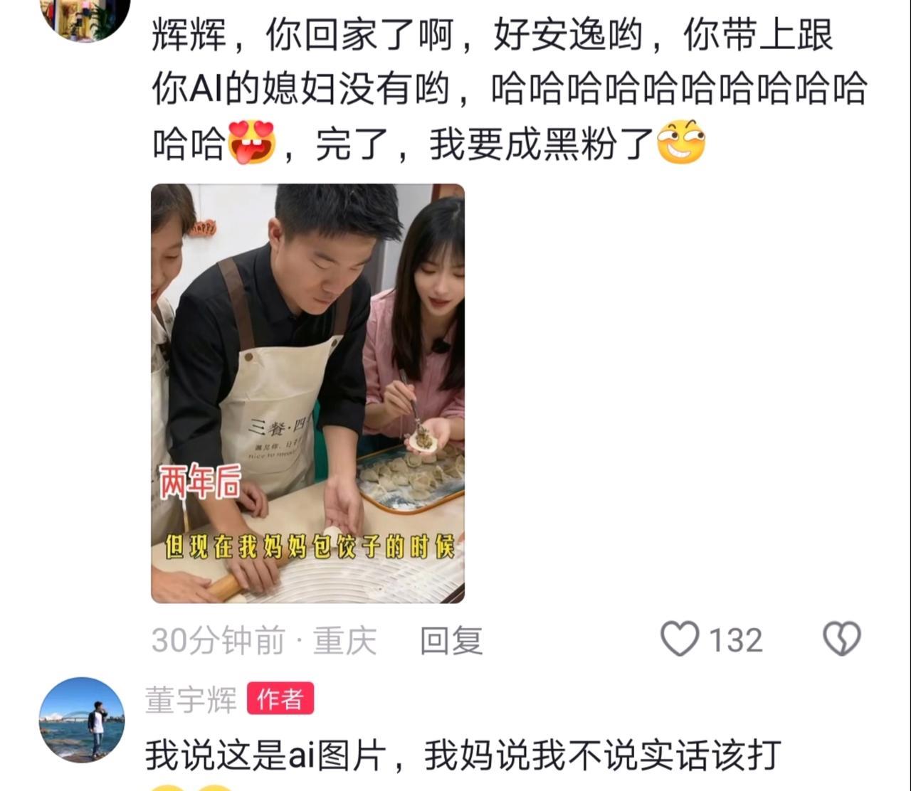 董宇辉回老家刚更新视频,没想到评论区一位网友发的图片,引起他妈妈的怀疑:“老二咋瞒着我?” 其实不怪阿姨怀疑,这张图片太像了,如果不仔细看,真像现场拍的。 董宇辉包着饺子,妈妈和媳妇在旁边帮忙,一家人其乐融融,画面温馨。 董宇辉看了,赶紧解释:这是网友自己ai的,不是真的。 可我妈说,不说实话,该打! 网友秒懂,阿姨这是将错就错啊,网友的心思,阿姨还不懂吗?刚好借机提醒提醒。 难怪彪哥说,每次回家呆三天,不能再多了,得赶紧分开,要不麻烦了。 #董宇辉#