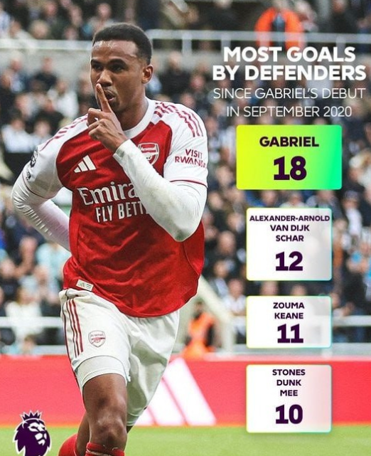 英超第一带刀后卫,加布里埃尔加盟阿森纳以来已经打进18球冠绝英超!