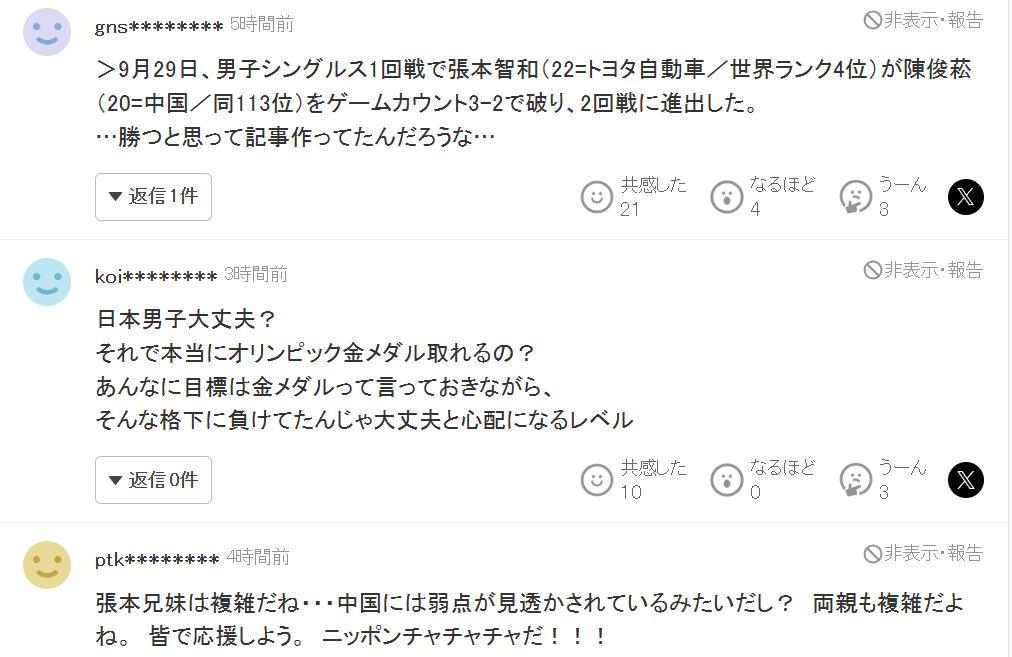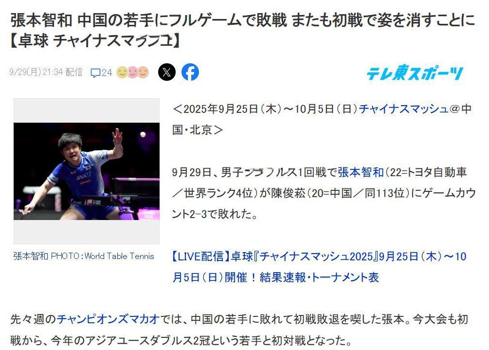 日本网友指责张本智和的父母!WTT中国大满贯张本智和被国乒小将陈俊崧淘汰遭遇一轮游,张本美和也被何卓佳击败。日本媒体对此进行了无情的报道,日本球迷更是不理解张本兄妹的不稳定表现,尤其是张本智和就是神经刀,谁都敢赢谁都敢输。有网友讽刺张本的父亲张宇母亲张凌“复杂”不够纯粹,事实上每当张本智和莫名其妙输给低排名选手都会有日本网友痛斥他心理差,父母培养模式有问题,缺少日本运动员与生俱来的武士道精神。#张本智和#