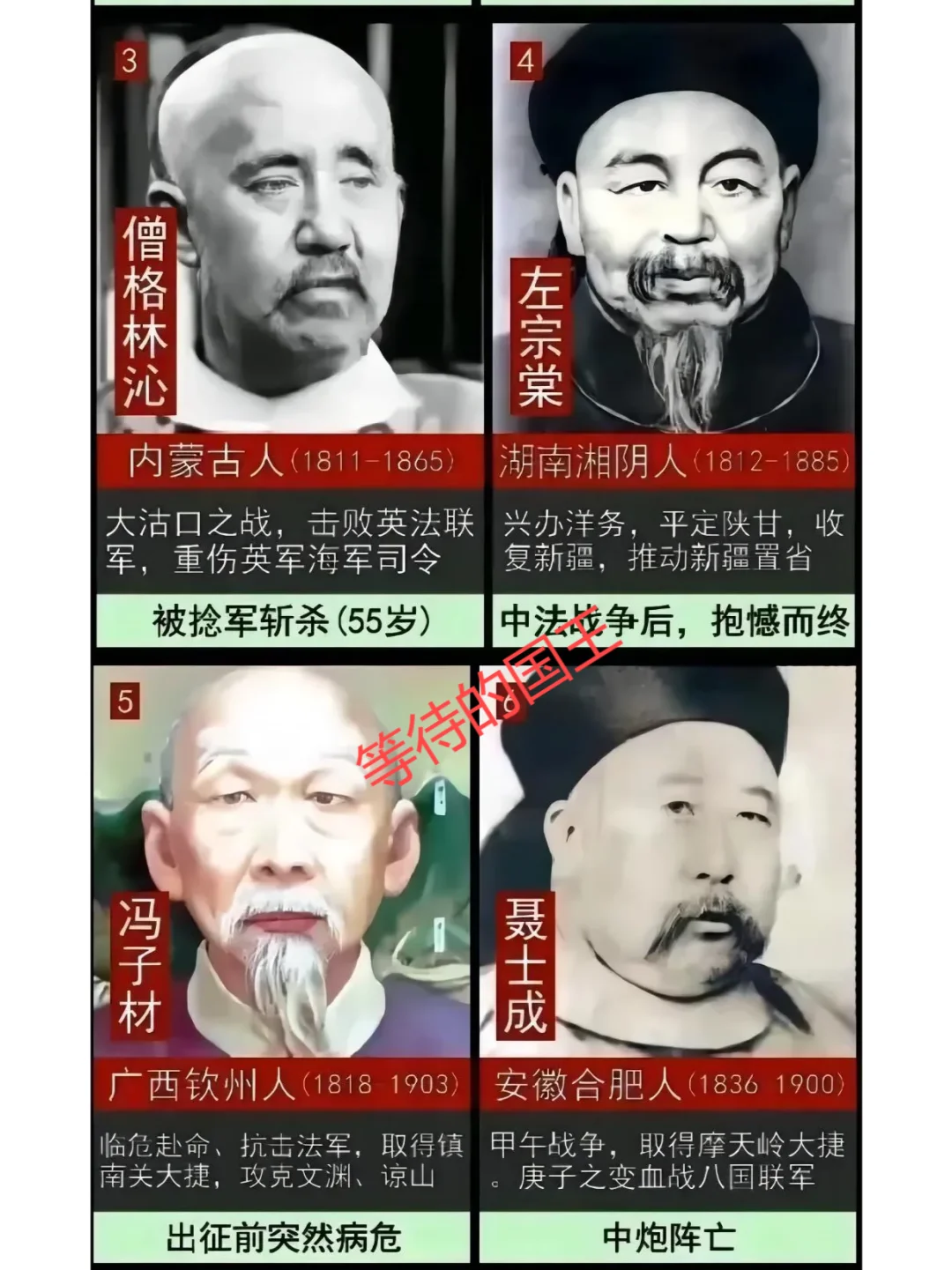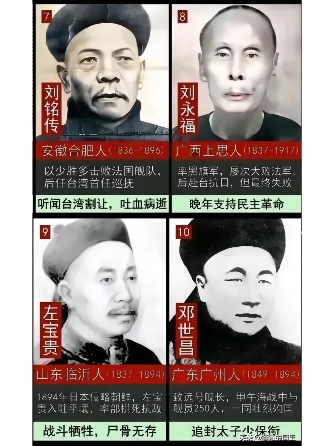 如图所示,清朝的“十大民族英雄”简介一览图。他们战日寇,斗英法,收新疆……面对外敌他们毫不退缩,带领所属军队与敌人展开了殊死搏斗,哪怕革职查办,中弹牺牲也在所不惜,他们都是民族英雄。值得一提的是位列第七的刘铭传将军,他出生于1936年道光十六年,从小的嫉恶如仇,锄强扶弱,在加入清军后,因为战功卓著,获得数次升迁,官至总兵,并建立了“铭家军”。曾在1884年击退侵占台湾基隆的法军,并在两年后(1886年)担任台湾省首任巡抚,他在台湾建电线、修铁路、办商务、设邮局、开港口……为台湾建设作出了巨大贡献,也被誉为“台湾近现代化之父”。