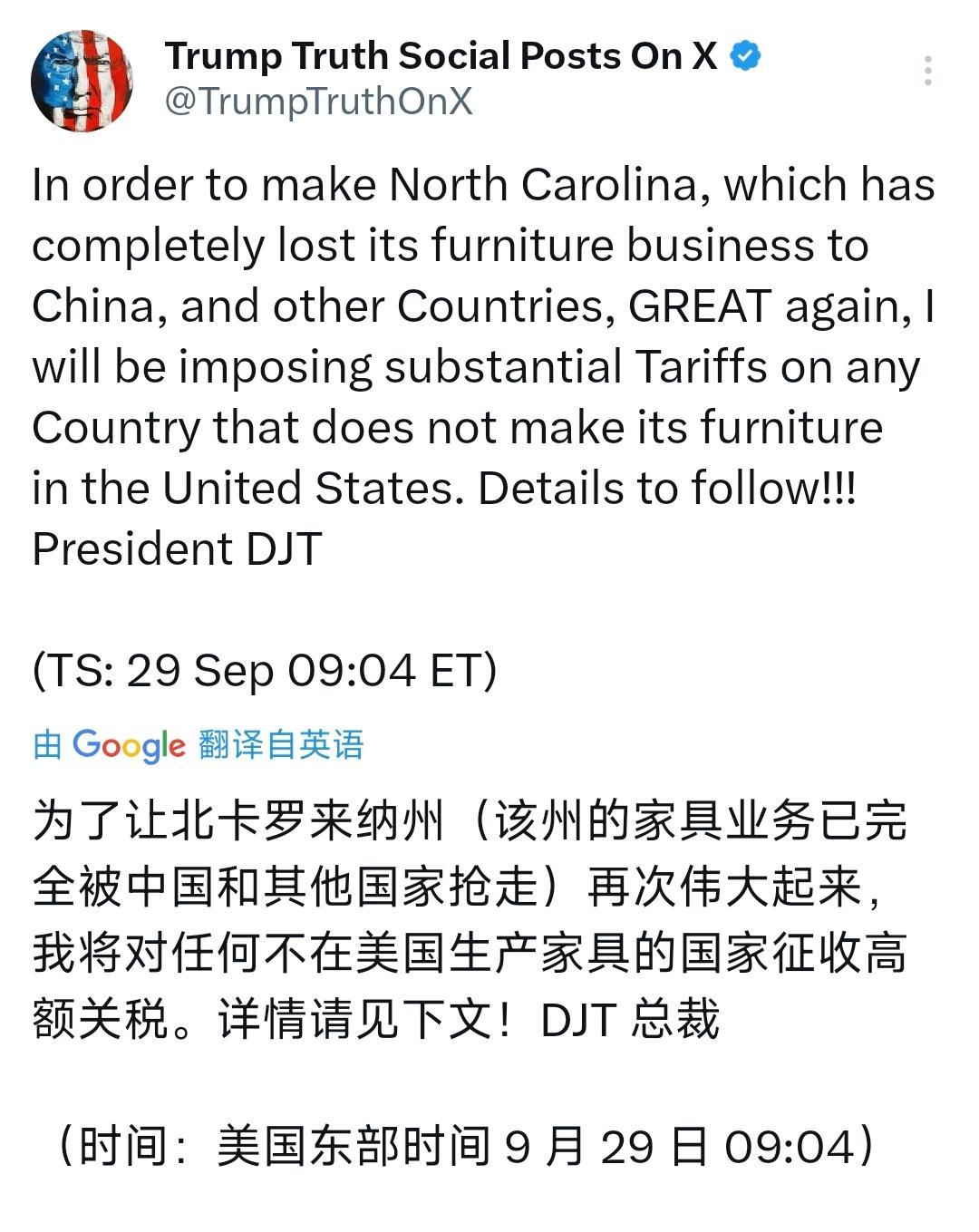 特朗普又盯上了中国家具。美国总统特朗普昨晚(北京时间9月29日晚)发文写道:“为了让北卡罗来纳州(该州的家具业务已完全被中国和其他国家抢走)再次伟大起来,我将对任何不在美国生产家具的国家征收高额关税。” [机智]评几句:特朗普又双叒叕挥舞关税大棒,这次竟盯上了中国家具。他天真地以为,高额关税能让北卡罗来纳州家具业“再次伟大”,却全然不考虑美国产品为何失去竞争力。是创新不足、成本高企,还是质量堪忧?特朗普一概不问,只知用关税这剂“猛药”。关税并非万能,保护主义只会让美国更封闭,也救不了北卡罗来纳州的家具业。