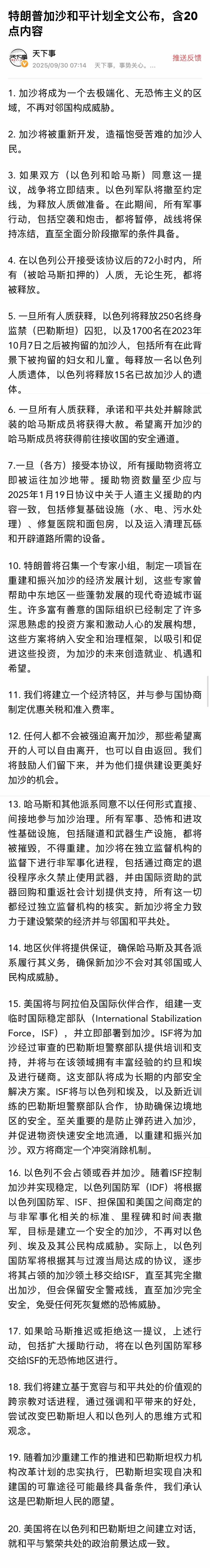 特朗普:若哈马斯拒绝将被全部消灭。 内塔尼亚胡:以色列同意美国提出的和平计划。 据悉,许多阿拉伯领导人也同意该计划。