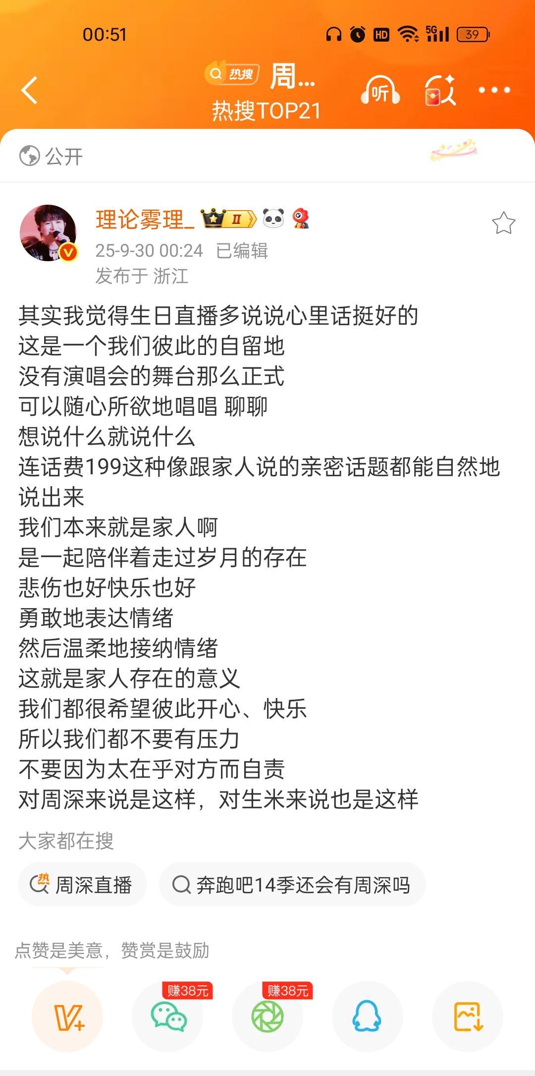 周深昨天是在澳门酒店直播的! 而且还用的是流量!一晚上跟流量较劲了好久,还跟我们说他的套餐是199的,真的是不把我们当外人![呲牙] 想去买流量,后面还发现没买成功[笑哭] 昨天没有迟到,19:29准时开始到00:00结束,整整4个半小时! 10点多就开始催大家要去洗漱休息了! #周深#
