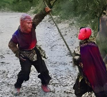 这是清朝人绘制的关于西游记故事的工笔画。这张工笔画常被认为是孙悟空大战哪吒。画上哪吒脚踩风火轮,腰挂混天绫,手持火尖枪,口里吐火,令孙悟空难以招架。孙悟空捂着眼睛,腾云驾雾迅速逃跑。哪吒紧跟其后不断吐火。 可是,有人说这并非哪吒而是红孩儿。因为哪吒根本不会用口喷火。他的武器可以喷火,但他不会以口喷火。因此,他们认为画中的根本不是哪吒而是红孩儿。红孩儿会口喷三昧真火。此三昧真火确实能让孙悟空难以招架。孙悟空的眼睛也曾被三昧真火烧伤。红孩儿也使用一把与哪吒同名而不同物的火尖枪。