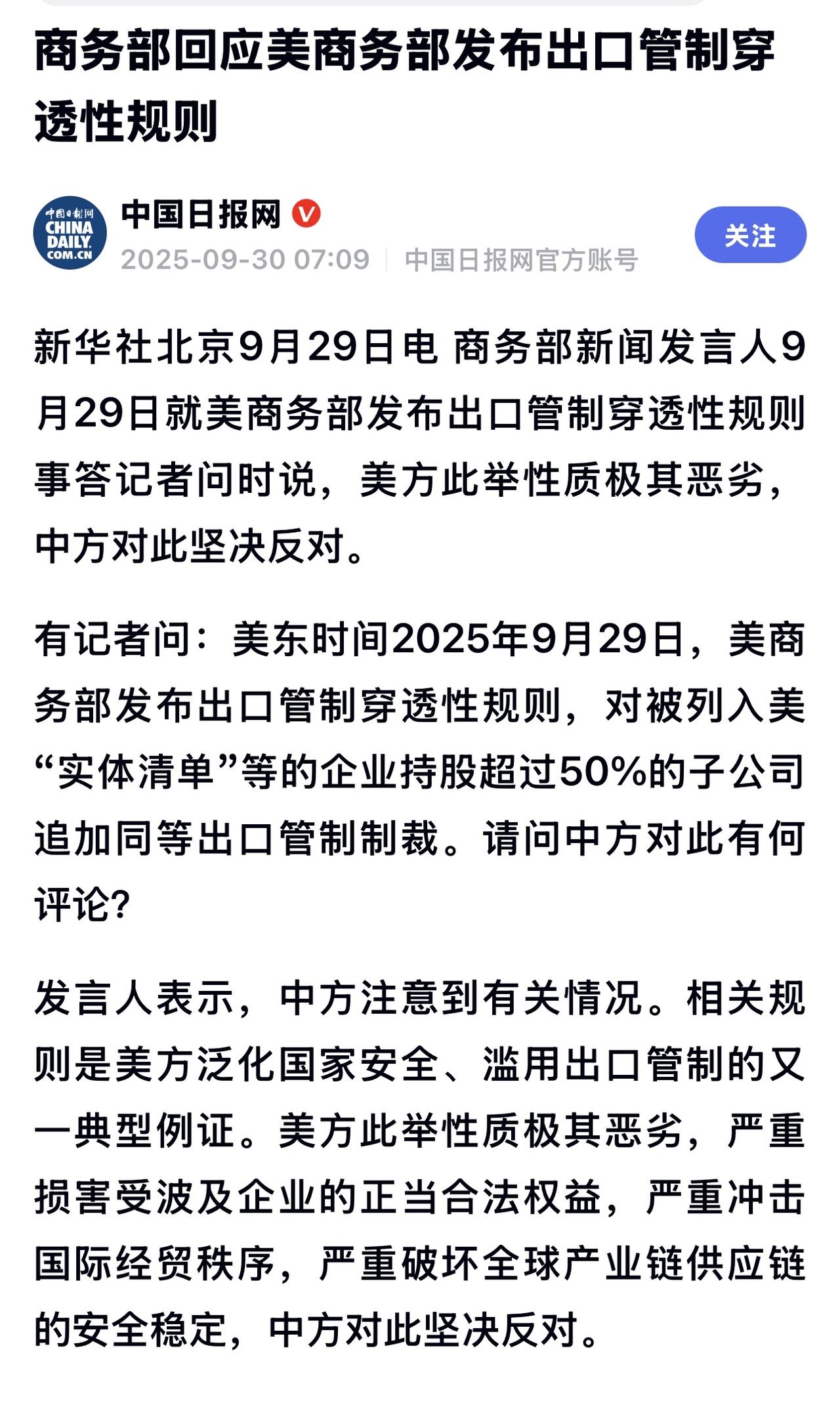 美方规则要求对被列入“实体清单”的企业,若其子公司持股超过50%,将追加同等出口管制制裁。这一措施直接针对中国企业,性质恶劣,严重损害企业合法权益,并破坏全球产业链稳定。