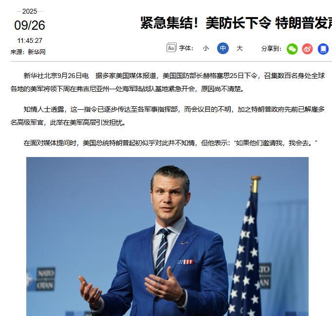 虚张声势!原本大家以为美国战争部成立之后要干点大事儿,一下子召集了全球的高级军官们回到五角大楼。结果没想到战争部长赫格塞斯只是为了和大家见个面,聊个天,因为他上任之后还没有见过这些将军。战争部这番操作令全世界笑掉大牙;因为本来所有人都以为美国准备下场踢球,准备亲自在某一个地区掀起战火,但是没想到只是为了看一场戏。 要知道,这些将军可不是普通职员。他们散布在全球数十个国家的热点地区,手里攥着实实在在的兵权。从欧洲的对峙前线到中东的冲突漩涡,每一个人都是区域军事指挥的核心。突然让他们放下手头所有事往回赶,任谁都会多想。 全球媒体的神经率先绷紧了。有人猜五角大楼要发起大规模军事行动,毕竟“战争部”的新名头还热乎着。也有人觉得要公布新国防战略,毕竟有消息说美国要把重心转回到本土和西半球。更离谱的猜测在美军内部流传,从集体体能测试到大规模解雇军官,甚至有人打趣说是不是要搞一场“鱿鱼游戏”。 五角大楼的反应更添神秘感。发言人肖恩·帕内尔只确认赫格塞思会发表讲话,对会议主题和议程半个字不提。这种遮遮掩掩的态度,让原本就紧张的气氛更添了几分诡异。 曾任五角大楼国防政策委员会成员的迈克尔·奥汉隆直接泼了冷水。他公开表示这操作“鲁莽又充满戏剧性”,全球几百名核心指挥官同时离岗,等于给潜在对手留出了5天的可乘之机。这话戳中了要害,美军的指挥与控制能力确实会因此出现空档。 更戏剧化的场面还在后面。退役陆军欧洲司令本·霍奇斯在社交媒体上发文,把这次集会比作1935年希特勒召集德国将军的会议,暗指其可能强迫军官效忠个人。没想到赫格塞思直接转发了这条推文,轻飘飘回了句“酷故事,将军”。这波迷之操作,让外界对会议目的更摸不着头脑了。 白宫的表态则显得混乱又滑稽。特朗普起初似乎对此一无所知,还误以为在召集外国军官,后来又说“邀请我就去”。副总统万斯则忙着淡化,说这种会面“一点也不罕见”,试图把媒体的关注压下去。但这种说辞没人买账,毕竟美军史上从未有过防长如此大规模召集高级军官线下开会的先例。 随着会议细节陆续曝光,这场闹剧的真相才慢慢浮出水面。有知情官员透露,会议时长预计只有一小时,主题竟然是“战士精神”。赫格塞思想借这个机会,给将领们灌输他推崇的军事文化,顺带推进平等机会改革和体能标准这类事务。 前五角大楼官员马克·坎西安一语道破天机。他说这更像是赫格塞思在炫耀权威,证明自己能随便召集这些高级将领,核心是给他们鼓劲施压,要求他们绝对忠诚并执行总统的计划。结合此前特朗普政府已解雇14名顶级军官,包括参谋长联席会议主席布朗,这层意味就更明显了。 国会助理的说法更直接,称这就是一场“鼓舞士气的集会”,主要聊的是文化问题。这个答案,跟全球此前的紧张预期形成了巨大反差。大家以为要“下场踢球”,结果只是来看了场“独角戏”。 这场折腾下来,成本高得惊人。超过一千人的交通和住宿开销暂且不论,全球军事部署的临时调整、指挥链条的短暂脱节,都是无法用金钱衡量的代价。而这一切的目的,不过是满足新任防长的个人诉求。 更讽刺的是,赫格塞思推动的那些改革本可以通过视频会议解决。五角大楼早就有高度安全的远程沟通技术,完全能实现跨区域讨论敏感事务。非要大费周章搞线下集会,除了制造噱头外毫无必要。 现在再看这场“全球大集结”,更像一场精心策划的政治表演。赫格塞思借着“战争部”的新招牌,用最夸张的方式刷了一波存在感,却暴露了美国军事决策层的短视与浮躁。 那些从全球各地赶回来的将军们,恐怕也会觉得哭笑不得。他们肩负着区域安全的重任,却要为一场一小时的“精神动员”长途奔袭。这场闹剧最终只会消耗美军的内部信任,让外界看了场实实在在的笑话。 官方信源:新华网《美防长下令 特朗普发声》,发布时间2025年9月26日