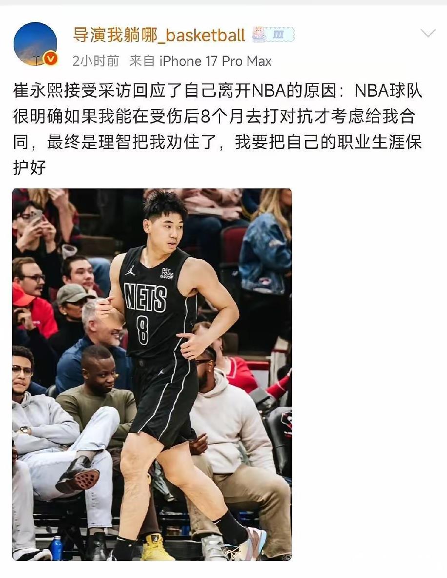 崔永熙误判了CBA联赛的对抗强度,更误判了广东宏远的防守强度!他在接受采访时候说,想要获得NBA的合同,要在他受伤8个月之后还能证明可以打对抗才行!所以他才放弃NBA选择回国,难道广东宏远的防守强度比NBA差很多吗?我甚至觉得崔永熙都不应该去NBA,镀金不成受伤了才想回来!如果一直在国内,按照十五年职业生涯算,恐怕各种代言和顶薪都要拿到手软了…