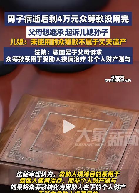 广东德庆,一男子重病住院却没钱做手术,妻子为给男子做手术,在网络平台上筹集善款,可刚凑够4万元,男子就突然病逝了,男子去世后,男子父母认为这4万元善款是男子的遗产,要求妻子交出来,在被女子拒绝后,男子父母直接将儿媳告上法庭,法院判了! 9月24日,大象新闻的一个视频,引发了大家的热议。 梁大哥是一名普普通通的工人,在工地干活已经有十多年了,每天早出晚归,天不亮就得起床,赶着第一班车去工地。 烈日当头的时候,他要在水泥地上搬运沉重的钢筋、水泥袋,汗水一滴一滴落在地上,衣服早已湿透;冬天的时候,北风刺骨,他依然得在寒风中支模、绑钢筋,手冻得僵硬却顾不上休息。 工地上的工作本就辛苦,加上工期紧、任务重,经常要加班到深夜,他常常顾不上吃饭,有时候一顿饭就啃个馒头、喝点凉水,身体早已透支。 工友们劝他注意身体,他总是笑笑:“没事,习惯了,咬咬牙就过去了。” 可就是这样一天,意外发生了,那天正是烈日当头,气温高达三十七八度,工地上的热浪一阵接一阵。 梁大哥正在搬运钢筋,突然感到胸口发闷,眼前一阵发黑,脚下一软,整个人重重倒在了工地上,周围的工友们吓坏了,赶紧丢下手里的活,跑过来呼喊:“梁哥!梁哥!” 有人立刻打电话叫救护车,有人掏出手机给他家里人报信。工友们七手八脚地把他扶到阴凉处,用衣服扇风,又有人去买水泼在他脸上。 可是梁大哥双眼紧闭,额头上布满汗珠,呼吸急促,送到医院之后,医生检查发现他患上了癌症,并且已经是晚期了,家里的积蓄很快见了底。 无奈之下,梁某的妻子通过网络众筹平台,把诊断证明和低保证明都放了上去,向陌生人求助。 善款很快筹集到位,但命运却没给这个家庭喘息的机会,钱到账不过半个多月,梁某还是走了,妻子处理完丈夫的丧事,还清了部分医疗和丧葬开销,手里还剩下四万多块。 在她心里,这笔钱烫手,它不是自己的,而是无数好心人的托付,要么还债,要么就该退回去或者转捐。 梁某的父母得知此事后,并没有感到宽慰,反而心里盘算起这笔钱的归属,在他们看来,儿子既然走了,留下的东西就算不上小家庭的私产,而是他们做父母的,也理应分到一份。 一开始,儿媳妇耐心地解释,可两位老人却听不进去,反倒认为她是在推脱,几次沟通不欢而散,亲情的纽带逐渐变得脆弱,矛盾越来越尖锐。 最终,两位老人做出了一个让人唏嘘的决定:把儿媳妇和两个孙子孙女告上了法庭,要求分割这笔社会捐赠的钱款。 法官在听取双方陈述后,明确表示:这笔善款并不是梁某在世时合法取得的个人财产,而是社会捐赠性质,因此依法不属于遗产范围。最终,法院驳回了老人们的诉求。 有人看到这个视频后表示:这可是自己亲孙子还在那,几万块都这样了。 信息来源:大象新闻