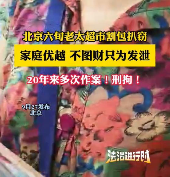 北京,一位六旬老太,每天都会到超市溜达。随身携带一把小刀,看到谁不顺眼,就用小刀扒拉人家的包,划个口子,顺手牵“羊”,拿走人家的财物。当时一位路人正好看到全过程,火速报警。被逮个正着的老太太说,自己也不图财,家里好几套房,有的是钱。她这样做,只有一个目的,就是发泄自己的情绪。只有破坏别人的财物,她的内心才能够满足。 9月27日记者报道,老太太被逮到时,一开始还不说真话,刀片在她手上,受害人的包已经被划开,她还能脸不红心不跳地说是用来修脚的。 最后才扛不住压力,把整件事和盘托出,原来是热心小伙目睹老太的作案全程后,一个电话喊来了执法人员,老太长期的违法行为才得到了曝光! 了解完情况后周围人更是倒吸一口凉气,原来她这样趁人不注意就割包偷钱的行为,已经持续了20多年,是个实打实的惯犯、老贼! 可她接下来的话更让人不能理解,多年行窃,她为的不是赚钱,而是满足扭曲的内心,只有毁坏他人财物,她才能觉得心里痛快、不堵得慌,所以她这20多年才屡次犯案。 出乎意料的是,老太家里非但不贫穷,反而还很富裕,根本就不是以偷盗谋生的人,所以她这种行为,纯粹就是素质低和心理有问题! 这样害人不利己的违法行为,终究要受到法律制裁,目前老太已被刑拘,但这个代价对她长期作案的情况来讲,显然轻的多。 发泄情绪可以有多种方式,只要在不影响他人的情况下,干什么都可以,可她偏偏选择偷盗,锻炼身体、培养爱好、做义工,有太多可供发泄的途径了,可她偏偏做出这种事,让人不齿! 有人说老太太这是习惯问题,偷的多了,习惯成自然,那一天不偷她就浑身难受,估计老太太也是年轻的时候走了错路,最后越走越深,陷在泥里出不来了。 (每天更新您关心的事,欢迎点赞关注,转发给朋友一起探讨!) 对此大家有什么看法? #我在罐头搞创作#