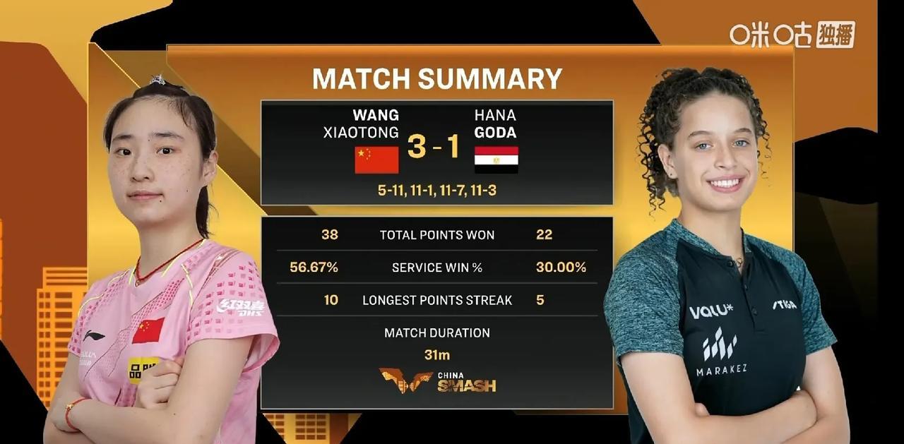 王晓彤在连丢一局的情况下,连拿三局,其中第二局送出了8:0和11:1的悬殊比分,以5:11;11:1;11:7;11:3战胜汉娜.高达,晋级WTT中国大满贯女单16强。 第三局中局,裁判判罚汉娜.高达发球遮挡,汉娜.高达为此提出鹰眼挑战,但挑战失败,有一点点遮挡。裁判是火眼。 下一轮,王晓彤将挑战世界第一孙颖莎。孙颖莎这是一轮路要打队友呀。