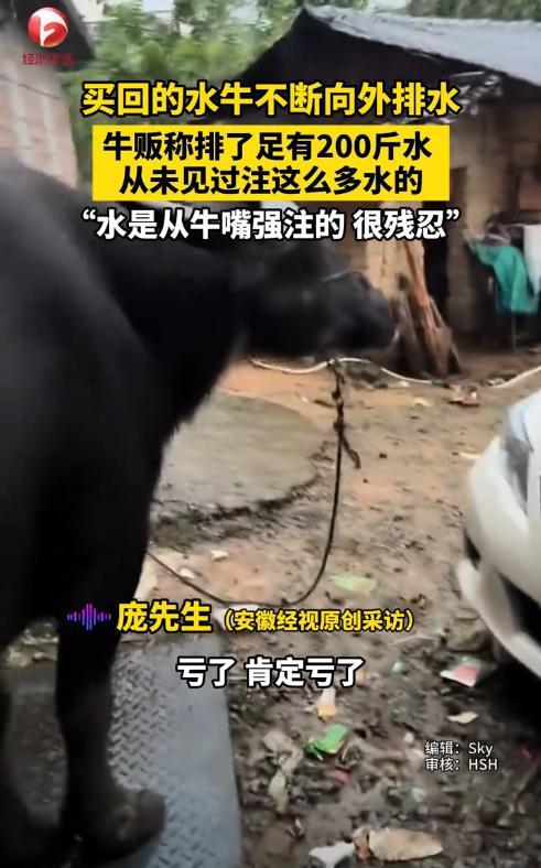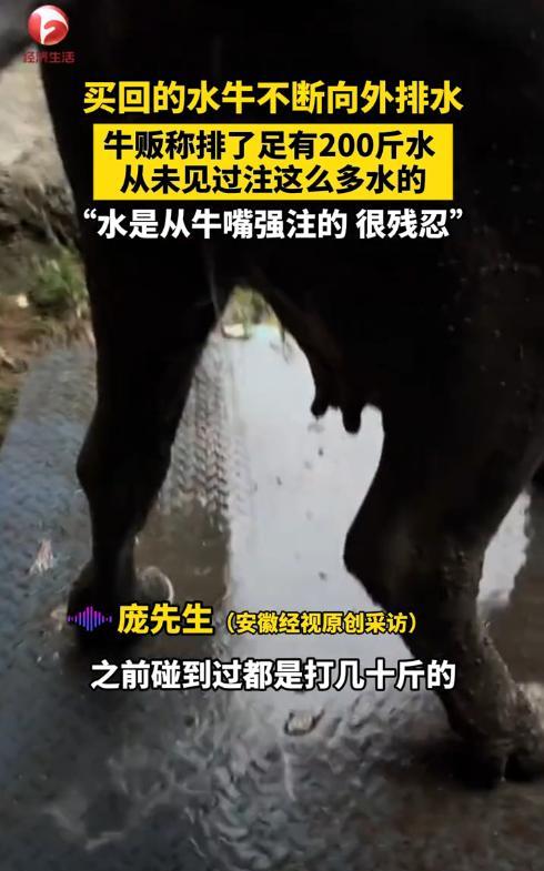 “太缺德了!”近日,广西钦州,一男子去乡下收牛,他见一头水牛长得非常结实,就花大价钱买了下来,可到家卸完车后,水牛却开始向外“排水”,原来,牛主人为了多卖点钱,从牛嘴里强灌水进去,最后男子重新称了一下,少了整整200斤!网友:这回亏大了。 牛是比较常见的一种家畜了,大家应该也都吃过牛肉,非常的可口,在乡下,很多村民都会在家中养上几头牛,等到长大后再卖掉,而在广西这边,养牛的人特别多,甚至还有专门的斗牛比赛。 据媒体9月30日的报道,庞先生是一名牛贩子,平日里经常下乡收牛,然后卖给有需要的客户,走街串巷这么长时间,他也积累了不少经验,一打眼几乎就能看出牛是否有问题。 可没想到,常在河边走,哪有不湿鞋,庞先生这次也翻了车! 这天,他去乡下收了一头重数百斤的大水牛,整头牛看起来非常壮实,所以他觉得这个体重应该没多少“水分”。没想到,水牛运回家后,竟然开始不断“漏水”! 等到水牛把水排得差不多后,庞先生重新将牛称了重,竟少了200斤。他表示以前也遇到过这种情况,但最多的也才灌几十斤水,这家人是真的狠,竟然灌了200斤,这回是真赔本了。 网友看后表示,看来牛肉涨价是有原因的,要是都这么搞,到最后真的要吃不起牛肉了!