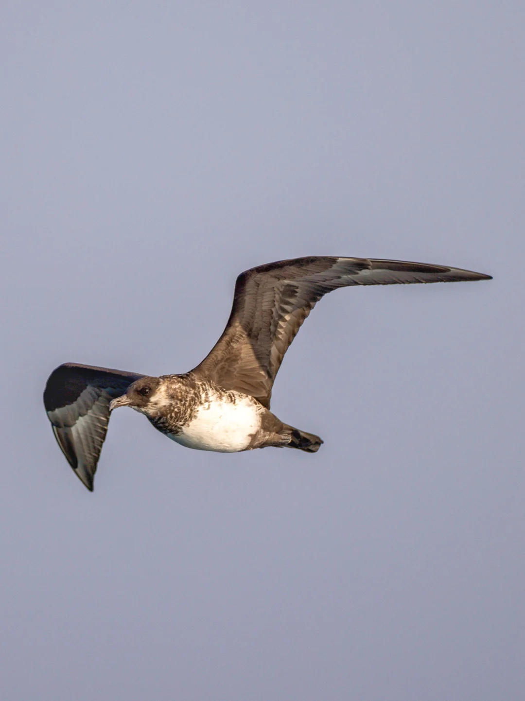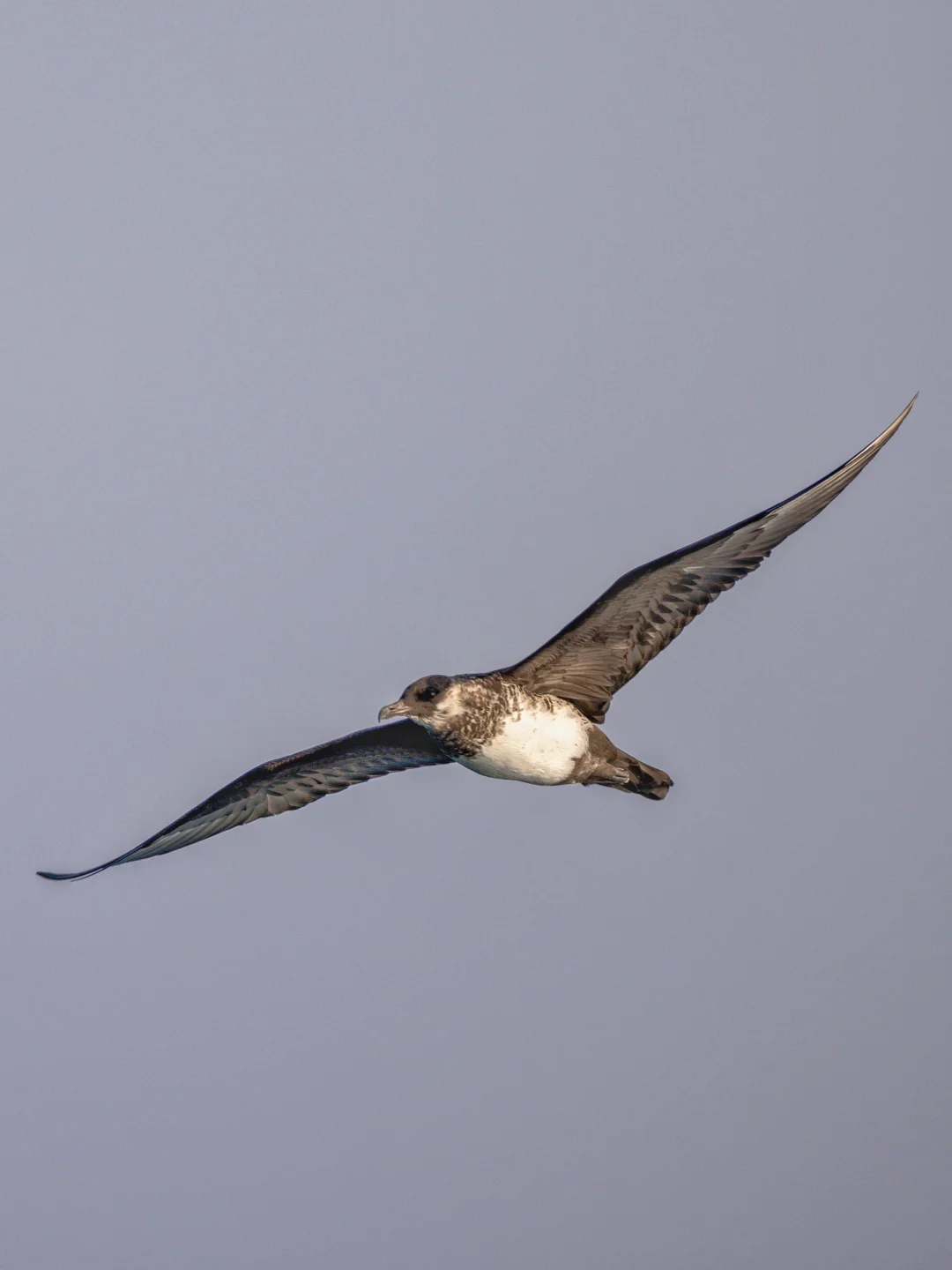 原创拍摄于2025.03 中贼鸥,Pomarine Jaeger,鸻形目贼鸥科中贼鸥属。海上大盗贼哈哈哈。 中贼鸥最独特的特征是拥有细长的杓状中央尾羽,成鸟繁殖羽淡色型的胸部条纹最明显。当然幼鸟体色变化较大,辨识难度上升。 这次出海,中贼鸥还是给面子,见到多次,并有一两次距离接近,还是很爽。