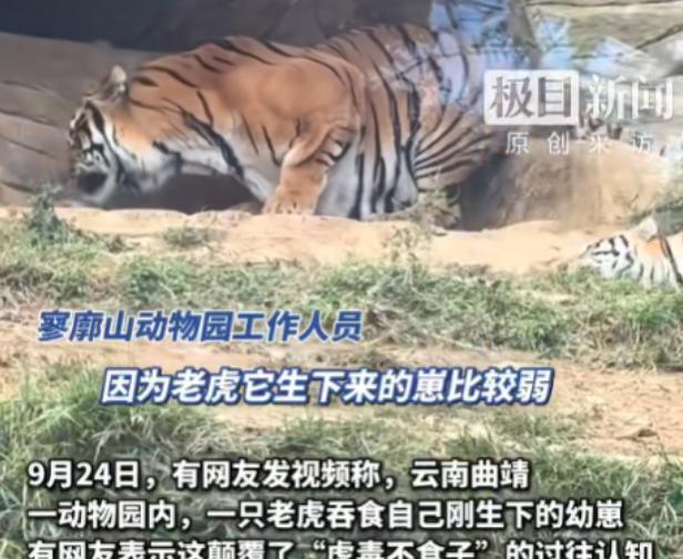 解释不清了!云南曲靖,女子去动物园看老虎,意外看到了老虎产子,可让她没想到的是,母老虎在生完崽后竟然把刚出生小虎崽给吃了,工作人员回应:属自然行为!网友:说好的虎毒不食子呢? “老虎怎么会吃自己的孩子?” 9月下旬,云南曲靖廖廓山动物园的一则消息,让不少人对“虎毒不食子”的认知产生了动摇。 起因是一段20秒的短视频:画面中,一只母虎正低头啃咬着刚生下的小虎崽,没有温情,只有让人揪心的动作。 这段视频在网上传开后,质疑声、不解声此起彼伏,有人说“太残忍了”,有人猜“动物园没管好”,也有人默默疑惑“这到底是为什么”。 要解开这个疑问,得先从视频里那只 母虎“阿黄”说起。 它是曲靖廖廓山动物园自己繁殖的老虎,今年5岁,体重大约200斤,站起来差不多2米高,这次是第一次当妈妈。 9月24号下午四点多,“阿黄”开始有了生产的迹象——它不再像平时那样趴在假山旁晒太阳,而是在展区角落来回踱步,尾巴夹得紧紧的,时不时抬头盯着外面的游客,喉咙里发出低低的咕噜声,那是动物应激时常见的警惕表现。 当时,游客李女士和朋友刚好在展区外,看到“阿黄”的反常举动,又听旁边常来的游客说“这是要生了”,便拿出手机准备记录。 没几分钟,“阿黄”趴在干草堆上不动了,身体微微起伏,很快,一个粉白色、只有巴掌大的小虎崽从它肚子底下钻了出来,身上还沾着黏液。 一开始,“阿黄”的动作特别温柔,用粗糙的舌头一下下舔着小虎崽,像是在给幼崽清理身体,李女士还跟朋友感慨“原来老虎当妈妈也这么细心”。 可这份细心没能持续多久。 大约五分钟后,“阿黄”突然咬住小虎崽的后颈,把它提了起来。 周围的游客一开始以为它是想把幼崽叼到更安全的地方,可下一秒,大家就看到“阿黄”的嘴巴开始慢慢咀嚼——它在吃自己的孩子。 小虎崽全程没动一下,也没发出任何声音,人群瞬间安静下来,有孩子吓得拉着家长要走,李女士的手也僵住了,手机还在录像,屏幕里的画面让她心里发紧。 缓过神后,李女士第一时间找到动物园的工作人员,急急忙忙地描述了刚才的场景,还问能不能赶紧进去制止。 穿蓝色工作服的工作人员先安抚了她的情绪,才慢慢解释:“这不是意外,是猫科动物的自然行为,我们不能随便干预。” 工作人员说,母虎会通过幼崽的反应判断是否存活,如果幼崽是死胎或者天生虚弱活不了,就可能出现吞食的情况。 而且刚生产完的母虎攻击性极强,工作人员贸然靠近会有危险,园里之前也遇到过两次类似情况。 但李女士还是不理解,她把手机里的录像给工作人员看,反复问“就看着它吃自己的孩子吗”。 工作人员又补充了一个关键信息:“动物园给老虎制定了固定的喂食标准,每天两餐,早上5斤新鲜鸡肉,下午5斤牛肉,都是按体重和营养需求配的,绝对不会让老虎饿肚子,你不用担心是没喂饱才导致的。” 这段20秒的录像被李女士发到网上后,争议更大了。 有人在评论区说“‘虎毒不食子’都是骗人的,以后再也不信这些老话了”,也有人猜测“是不是动物园照顾得不好,让母虎受了应激,才做出这种事”。 不过,也有一些冷静的网友站出来说:“我在《动物世界》里见过狮子也这样,好像是为了不让死胎的气味引来天敌,是生存本能。” 面对越来越多的疑问,动物园的兽医负责人专门出面回应,带来了更多细节。 他说,生产前一周,兽医就给“阿黄”做过产检,当时显示幼崽发育正常,没发现任何问题。 “我们在监控室里观察了15分钟,看到‘阿黄’反复舔幼崽,可幼崽一直没动,也没发出叫声。 要是活的小虎崽,被舔舐后肯定会有反应,要么叫要么爬,这是基本的生命体征,不会一点动静都没有。” 为了让大家更容易理解,兽医还举了个常见的例子:“农村养过猫的人应该都知道,要是母猫生下的幼崽是死胎,或者天生残疾活不了,母猫也会把幼崽叼到隐蔽的地方,有的甚至会直接吃掉。 那么你们明白,为什么老虎会这样做了吗? 如果各位看官老爷们已经选择阅读了此文,麻烦您点一下关注,既方便您进行讨论和分享,又能给带来不一样的参与感,感谢各位看官老爷们的支持!