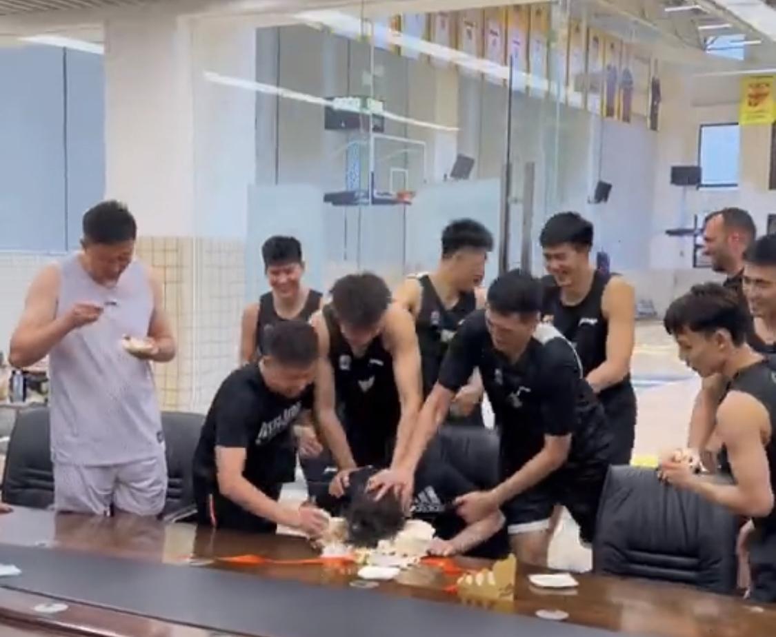看广东宏远男篮外援助教拉多维奇是如何被队员整“惨”的! 广东宏远男篮新任外援助教拉多维奇生日之际,俱乐部为其准备了生日蛋糕。当然根据队中传统,向过生日的人脸上抹蛋糕的仪式是必不可少的一个环节,即使是外援助教也没有例外。于是,大家一起动手把助教的头按在蛋糕上,弄得助教满头蛋糕,实在是“惨不忍睹”。而杜锋教练则是一边吃着蛋糕,一边乐哈哈地看着这搞笑的一幕。虽然是搞笑,但传递的一种祝福和温暖。46岁的拉多维奇曾经是黑山男篮主教练,带队打过欧洲杯、世界杯等多项国际重大赛事,有着丰富的执教经验。相信广东男篮有了他的助力,今后一定会有新的进步和发展。