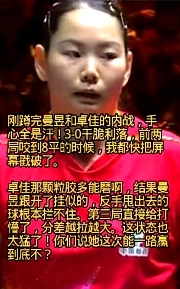 曼昱3-0碾压,颗粒胶也拦不住! 8平那球,我手机差点飞出去。 卓佳的颗粒胶专门缠人,球过来像拐弯,一般对手早烦了。 曼昱偏不,她反手一板甩直线,球快得连镜头都糊。 这不是运气,是她提前半步到位,肘一沉就把旋转吃透。 第三局卓佳发长球想拼,曼昱退台半步,直接反拉,分差从两分变六分,气就断了。 颗粒胶最怕质量对不上,曼昱每一板都往底线深压,卓佳挡回来的球跳得高,立刻被拍死。 现场教练喊也喊不回节奏。 我看她握拳那一下,眼里全是火,她要把这场当决赛预演,一点松都不给。 有人担心她后头没劲,我看她汗都没怎么出,留着力气准备下一场。 想赢到底,就得把每一局当最后一局打。 狠到底的人,才配拿最后的奖杯,你说是不是?