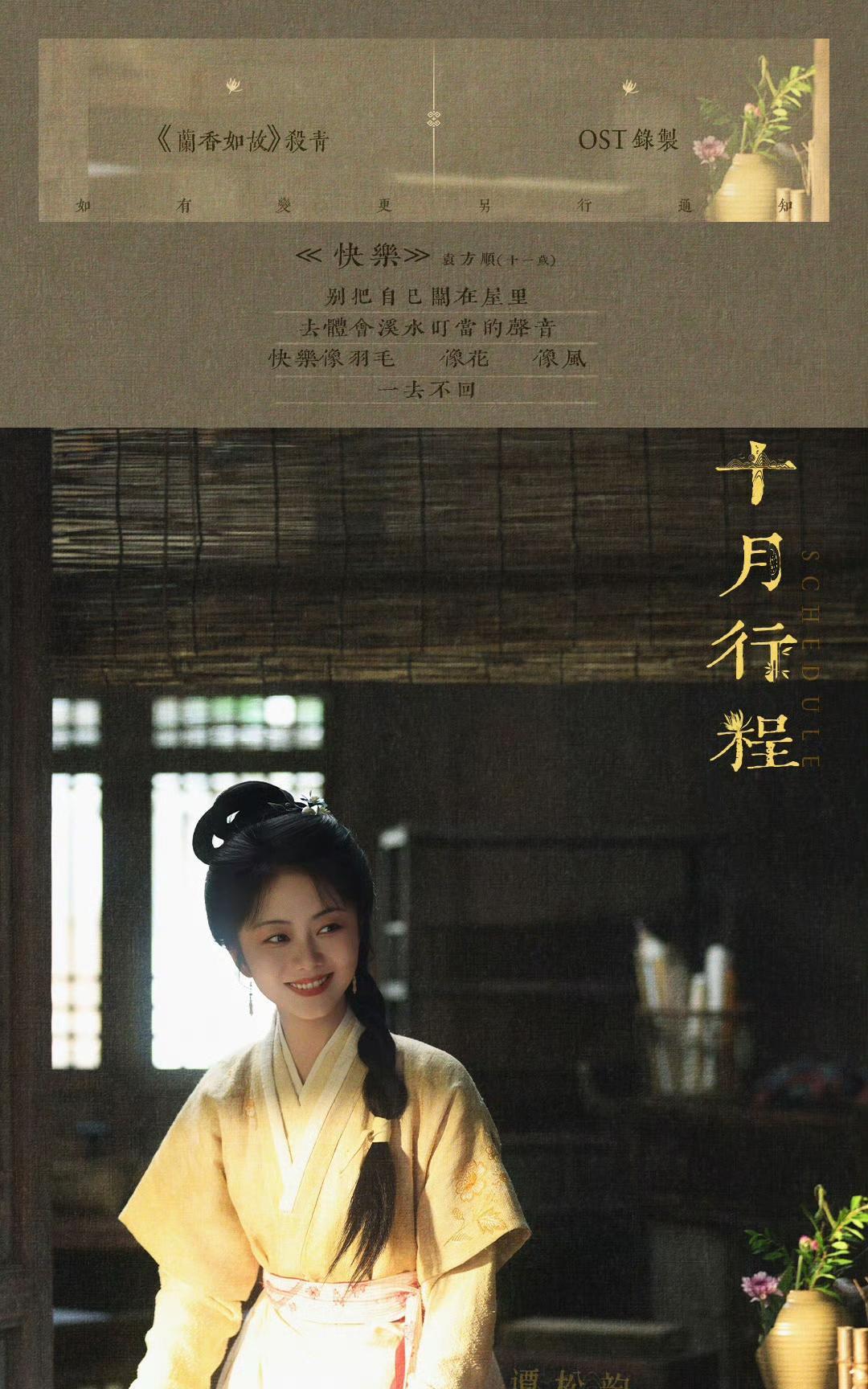 两小姐更新10月行程啦! 两小姐本月兰香如故要杀青啦!她还要录哪部剧的OST呢,她的每部剧都会唱主题曲的,这次是不是和小侯合唱一首呢? 这次行程图用的是繁体字,是不是意思是兰香是古代人哦! 兰香穿着鹅黄色的袄裙,单侧麻花辫,阳光温暖的洒在她身上,显得她更加明媚鲜活,她活的潇洒,笑的恣意随性,看的人心情大好! 恭喜谭松韵快杀青啦!也祝贺谭松韵喜提三部待播剧,逍遥,我和我的命,兰香如故!