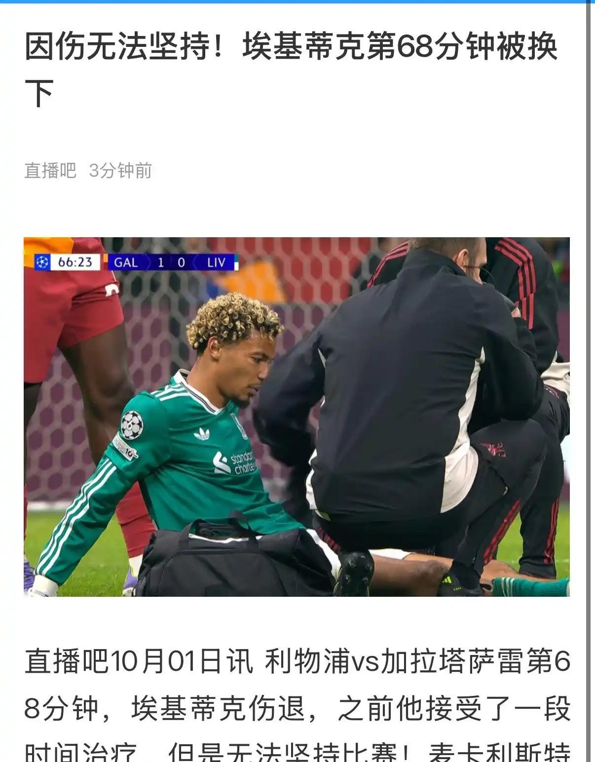阿森纳球迷看到了夺冠希望,利物浦一场欧冠伤两个球员,埃利松和埃基蒂克! 门将是利物浦最稳定的位置,埃基蒂克也是目前利物浦发挥最好前锋,他俩暂时要养伤了。 还有阿森纳轻松续约萨利巴,而利物浦的科纳特铁了心要去皇马。 这说明萨利巴忠诚,就要和阿森纳一起拿冠军! 反观利物浦总是出逆子,今年阿诺德,明年科纳特,还都要去皇马。 马上利物浦踢切尔西,踢曼联,只要翻船,英超榜首换球队啦! 天时地利人和,都在阿森纳这一边。[呲牙]