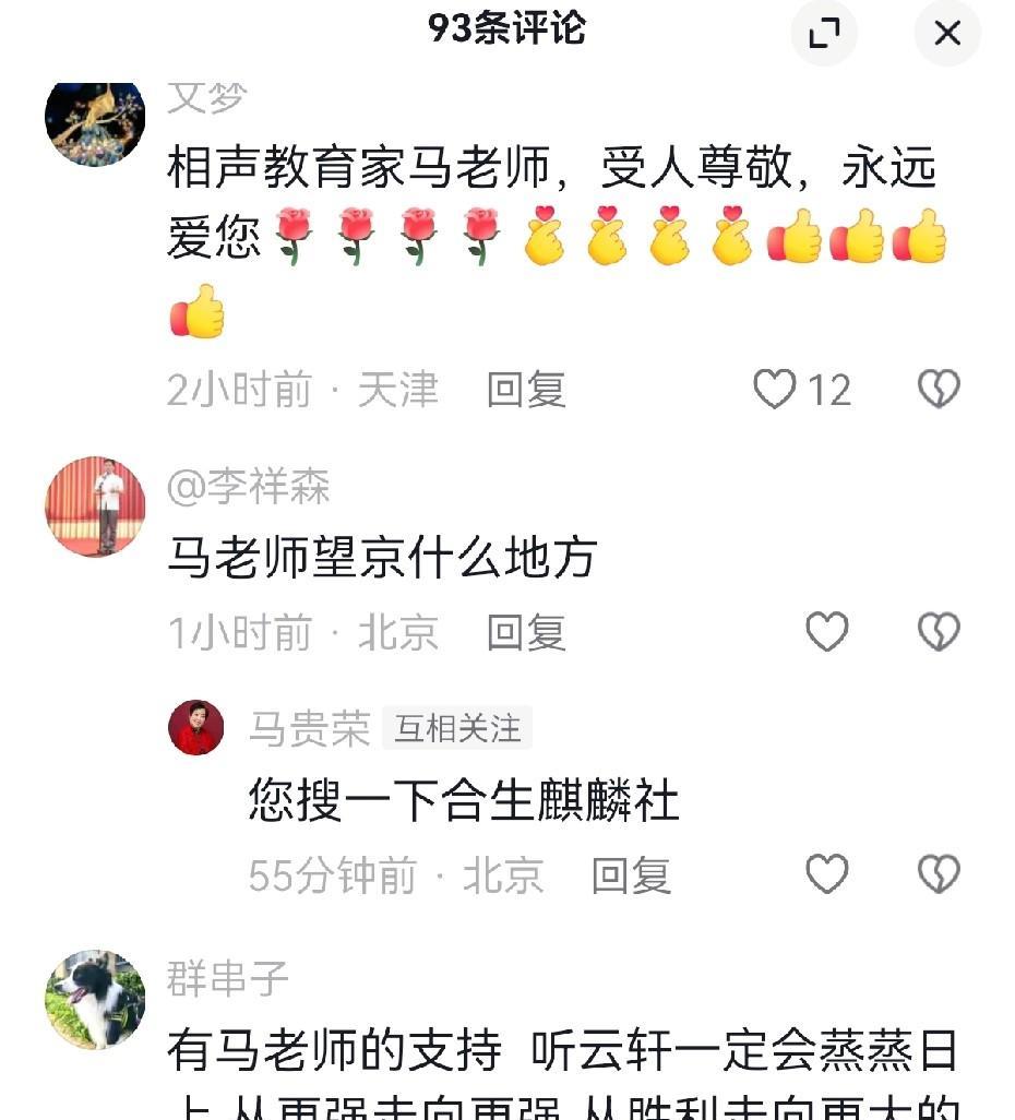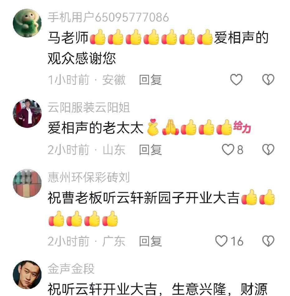 #相声界恩怨情仇# 马贵荣发视频,祝贺曹云金新园子开张。 马贵荣老师,虽然已经是70多岁的老太太了,但她依然热爱相声,依然在为相声默默奉献。 马贵荣丝毫也不掩饰,她对曹云金的支持和欣赏,称自己就是曹云金的铁粉。 曹云金直播的时候,马贵荣也经常去刷礼物;曹云金在小园子里说相声的时候,马贵荣也经常买票去听相声。 刚刚刷到马贵荣的一条视频,视频很简单,只有一张图片和一行大字“新园子开张喽”(图二)。 曹云金听云轩的第3家剧场——合生麒麟社,今天正式开业。 因为砸缸和支持曹云金,马贵荣受到了不少网友的诟病和攻击,但老太太并没有受到什么影响,反而是越战越勇。 这条视频是早上7点多发的,到现在已经有近500个点赞,还有97条评论,大都是称赞马贵荣和支持听云轩的。 为热爱相声的马贵荣老师点赞。
