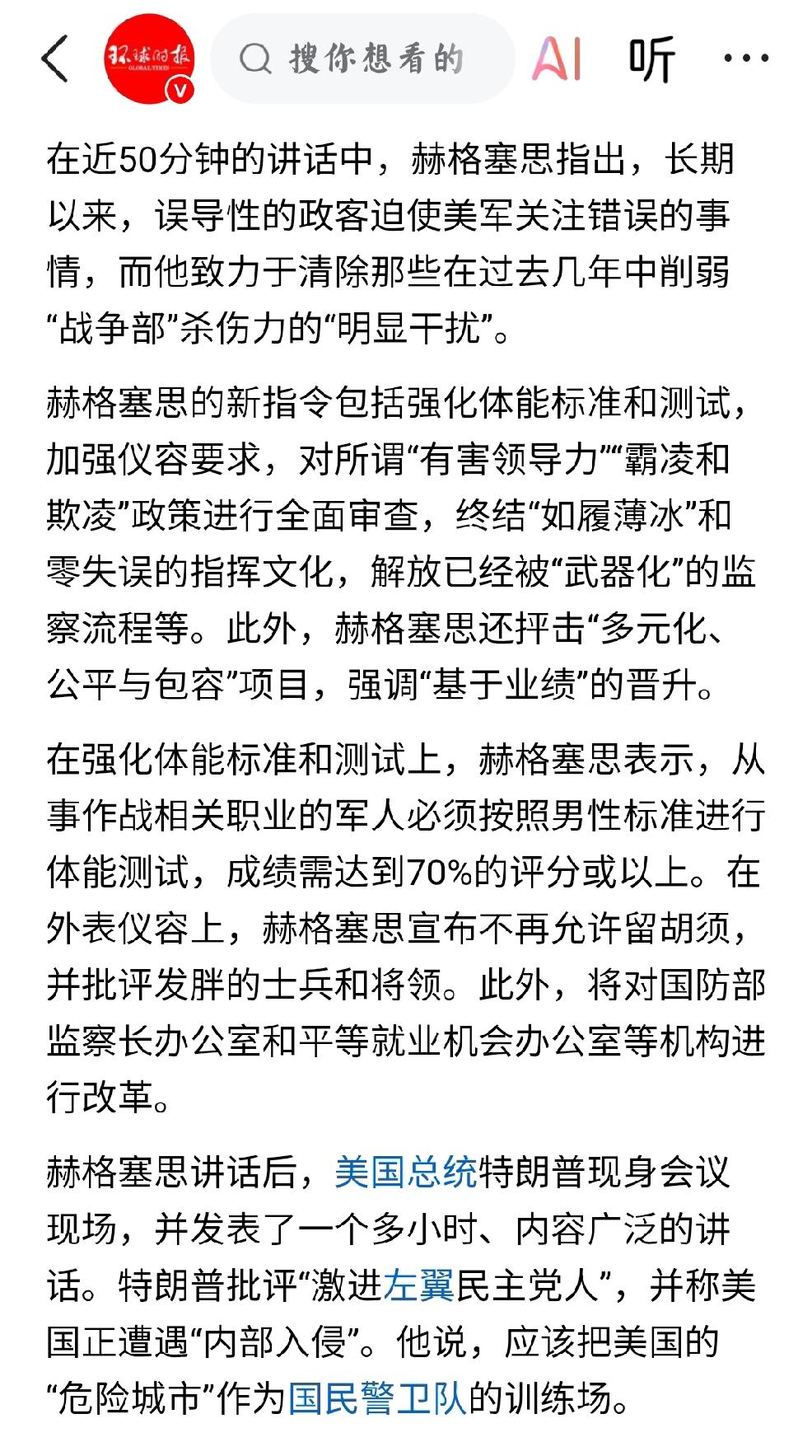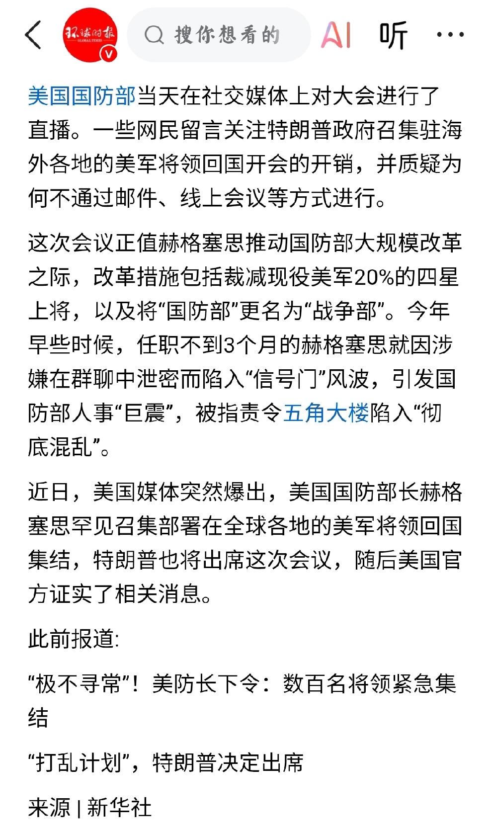 美国:说与做是南辕北辙 个人认为,不要看-当下的特朗普说什么,不必纠结-美国战争部长,集结美军将领后的发言,因为那都是表演给美国基层人看的,这是为了选举而进行的真人秀,不必-不能-不要较真。 美国总统特朗普上台几个月发动的全球关税战,取得的成果是美国经济高通胀,高负债,高失业,高对立。这是美国现状。 想想美国这届政府也不过是四年有效期,怎么能够摘取?必须长期性坚守才能取得的成果。 特朗普需要的是画饼充饥,需要的是打扑克牌,一局一局的进行,拖延四年,甩牌走人。