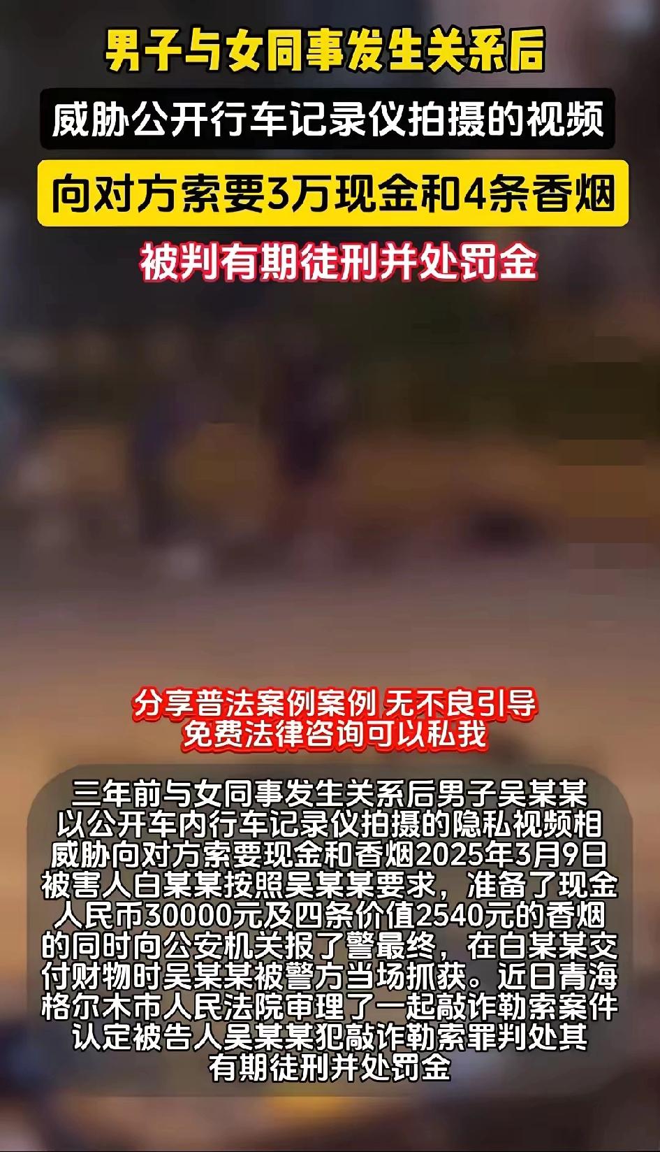 骗色又敲诈终进班房! 青海格尔木的吴某某, 跟女同事白某某在车里发生关系后,居然偷偷用行车记录仪录了视频,转头就拿这个要挟人家——要么给3万块钱加4条大重九香烟,要么就把视频发给人家老公、传到网上去。 这哪是同事啊,分明是披着人皮的恶狼!拿亲密关系当勒索筹码,既骗感情又图钱财,算盘打得全天下都能听见。 好在白某某没被吓住,一边假装答应准备钱物,一边悄悄报了警,等吴某某美滋滋来拿钱时,直接被警察当场拿下。最后法院判了他两年有期徒刑,还罚了1000块,真是大快人心! 要我说,这种人根本不配称“同事”,就是职场里的毒瘤。遇到这种威胁,千万不能妥协,像白某某这样冷静报警才是最正确的选择。 你们身边有没有听过类似的糟心事?如果是你遇到这种情况,会第一时间怎么做?