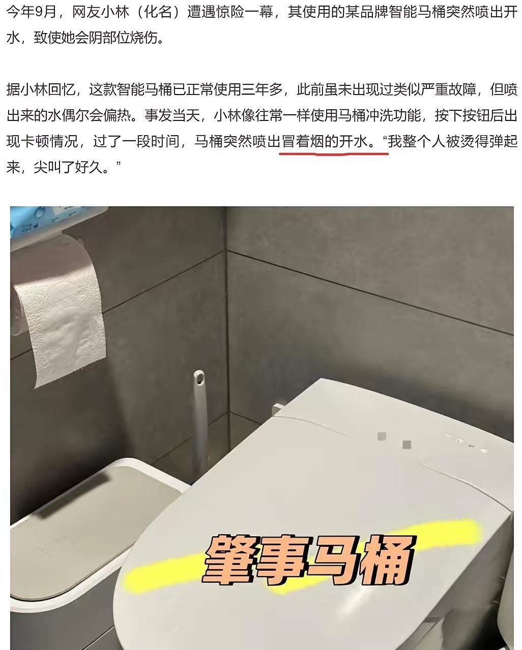 想想都头皮发麻! 女子用智能马桶冲洗时, 按钮卡顿后突然喷出“冒烟的开水”,直接被烫得尖叫弹起,即便冲了一小时冷水,还是被诊断为二度烧伤 。这哪是提升幸福感的家电,简直是藏在卫生间的“隐形烙铁”! 别以为这是个例,黑猫投诉上三个月就有700多条相关投诉,辽宁也曾有女子被马桶盖喷出的热水烫成二度伤,原因竟是水垢堵塞导致水温骤升。 很多人买智能马桶只看自动翻盖、暖风烘干这些花功能,却忽略了最关键的安全底线。 其实隐患早有信号,不少人都遇到过水温偶尔偏热的情况,却没当回事。智能的核心该是安全,而非堆砌功能。选带喷头自洁、双重过滤的款式,定期清理水垢,比啥花里胡哨的设计都重要。 你家的智能马桶有没有出现过水温异常?那些看似方便的功能,真的做足安全防护了吗?