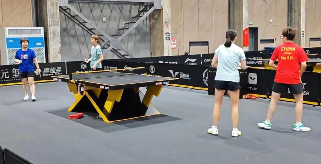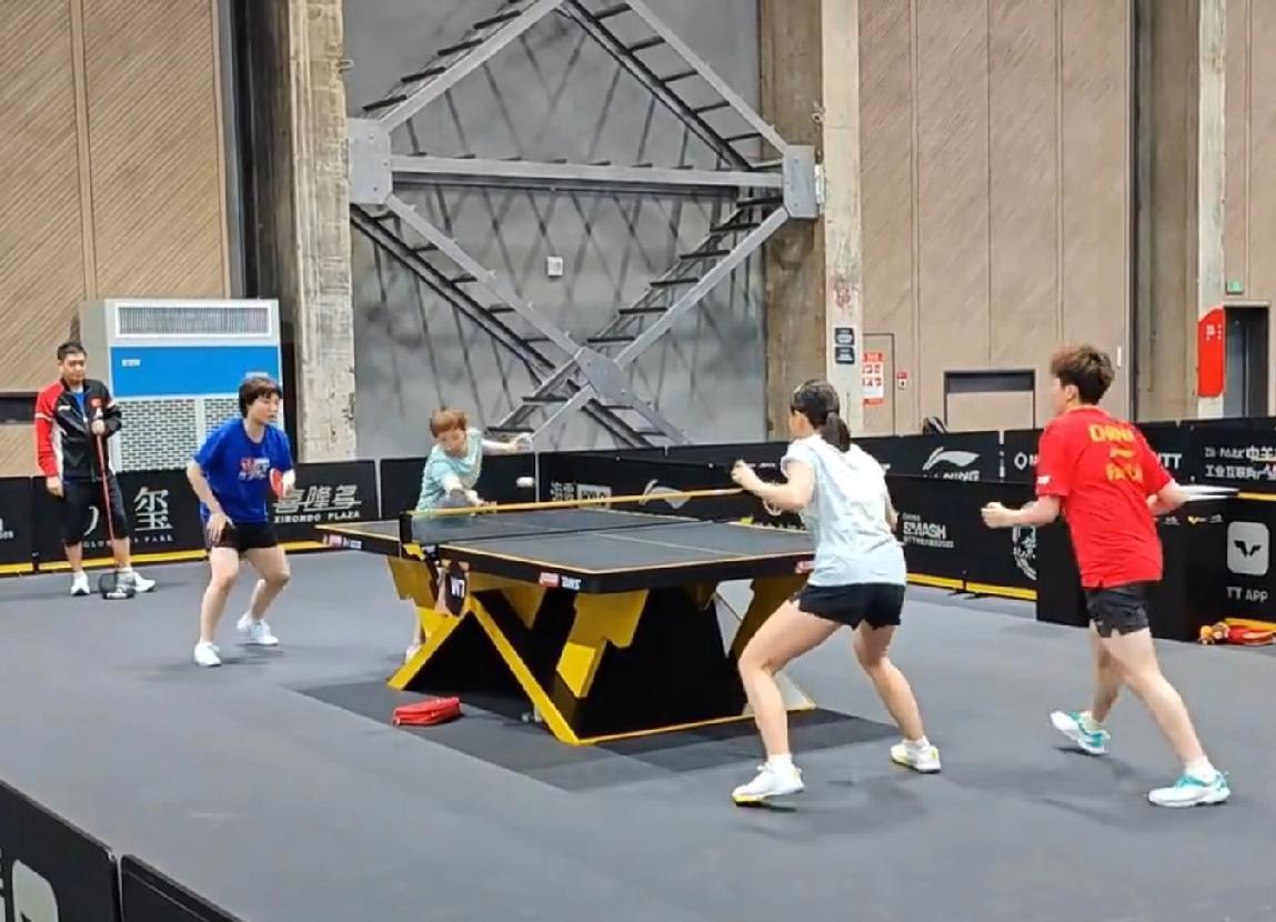 下午刚刚零封战胜宿敌巴特拉的王曼昱,现在又出现在WTT中国大满贯的训练馆,与蒯曼搭档配合准备一会儿的女双首秀! 陪练组合是河北队的姚睿轩和黑龙江队的小队员。 看来本场比赛的场边教练是邱贻可指导了! 马琳教练本次中国大满贯比赛一直没露面。 有传闻说是马琳教练在一次聚会后摔倒又受伤了,需要休息。 也有传闻是马琳家生二胎呢! 反正无论如何,在北京家门口举办的大赛,马琳主教练不去,肯定是因为什么事情脱不开身啦! 这回比赛比起考验队员更是考验女队教练组,在没有马琳教练在场,能否指导好运动员赢球! 期待曼昱蒯曼女双首秀旗开得胜!