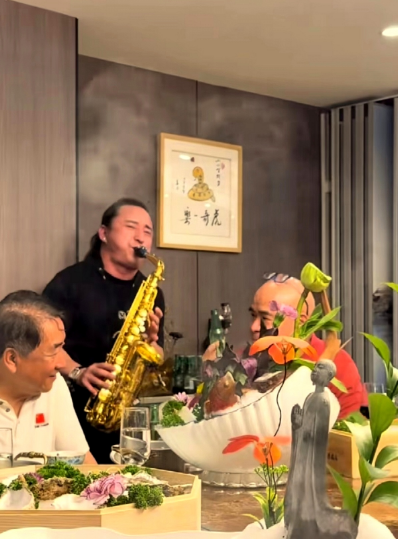 席间最抢镜的要数萨克斯王子刘家军。这位音乐家可不光是吹得好,当年央视《曲苑杂坛》里那些经典旋律不少都是他操刀的。他正端着萨克斯给大伙助兴,悠扬乐曲把聚会气氛烘托得喜气洋洋的。
