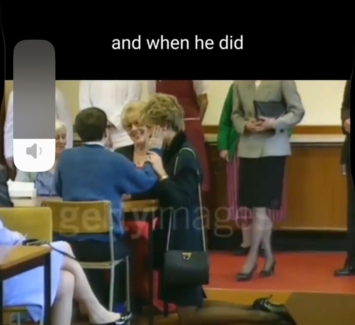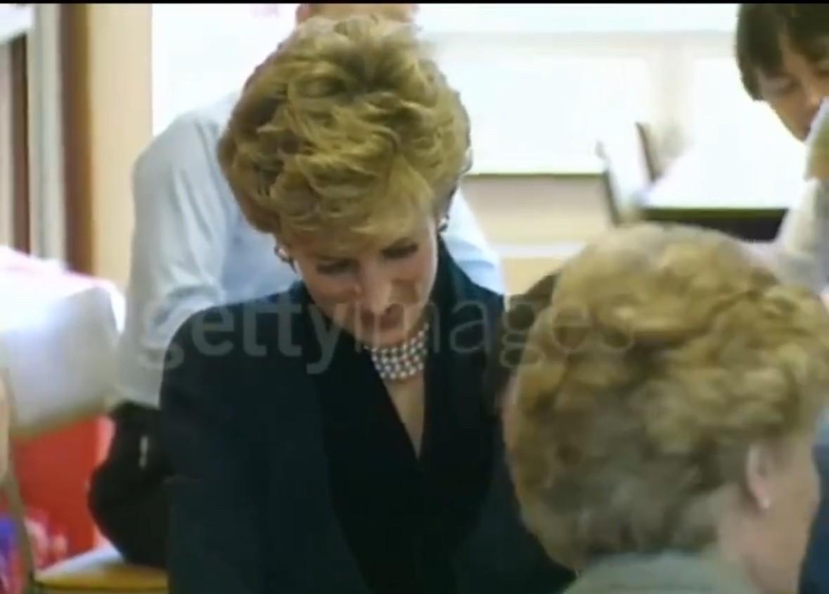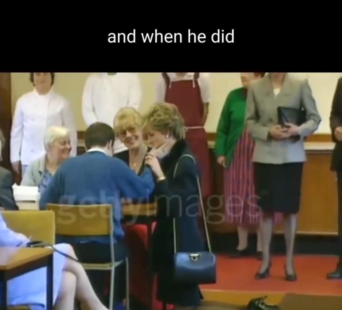 戴安娜王妃扶着一位盲人,托住她的脸。当这位盲人知道她在和他握手时,他问她是否可以摸摸她的脸。盲人摸了之后,说道:“你的皮肤很柔软,你很漂亮。” 让人不禁好奇……以皇室地位,谁会跪下来,让一个普通的盲人触摸她的脸…… 然而,善良的戴安娜做到了,她太棒了。我认为凯特也会的。尤其是和孩子们相处,她有一种与生俱来的能力。