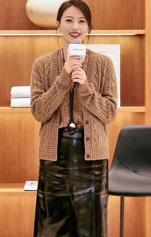 高圆圆身穿咖色毛衣+半身皮裙,真时髦洋气显气质