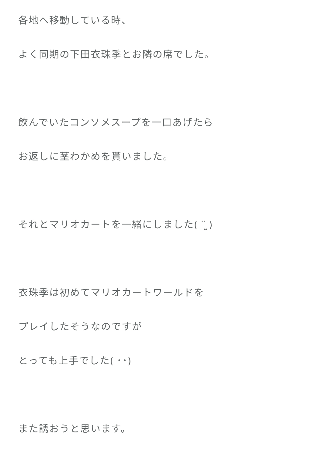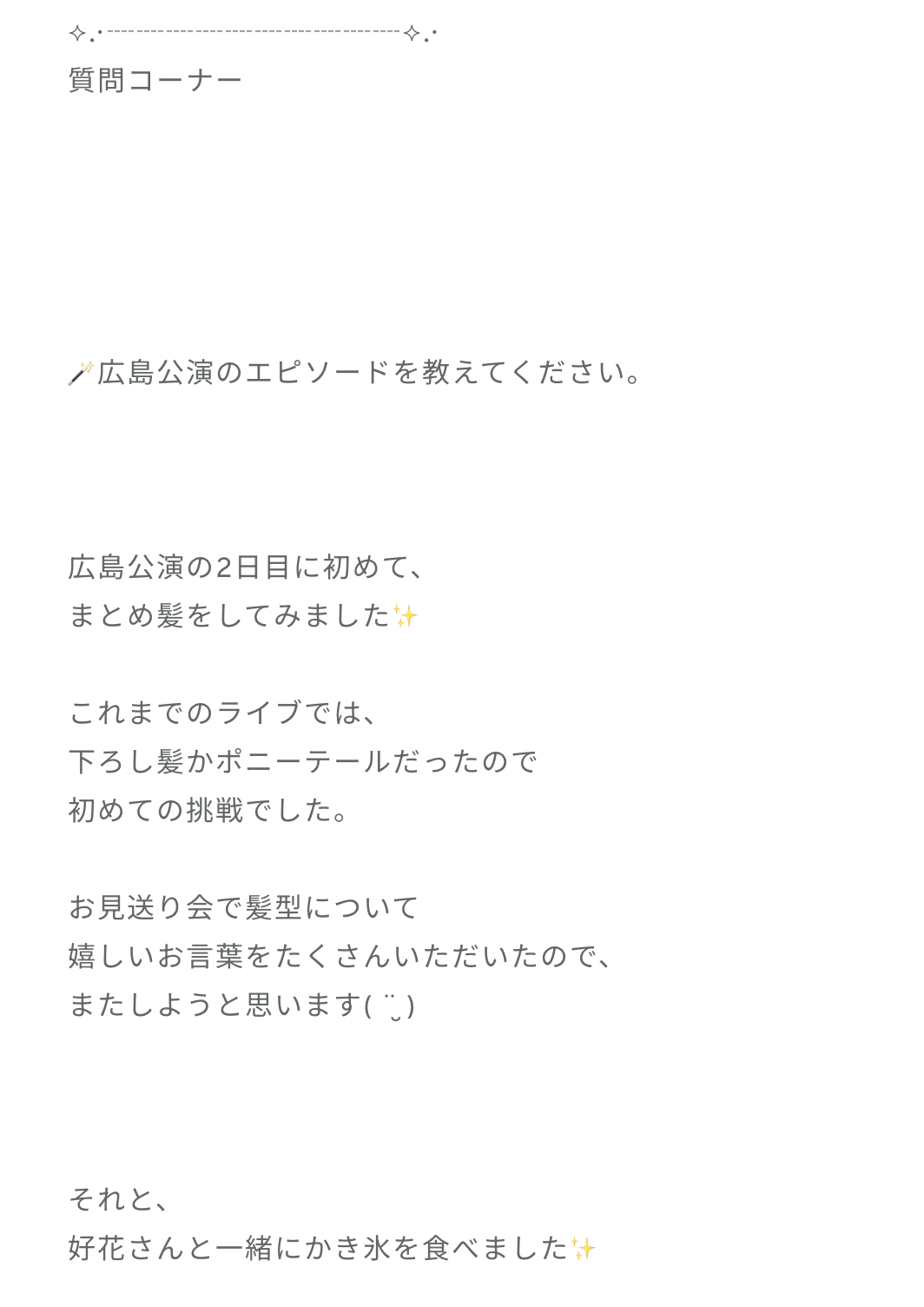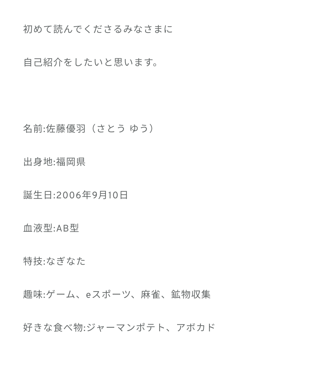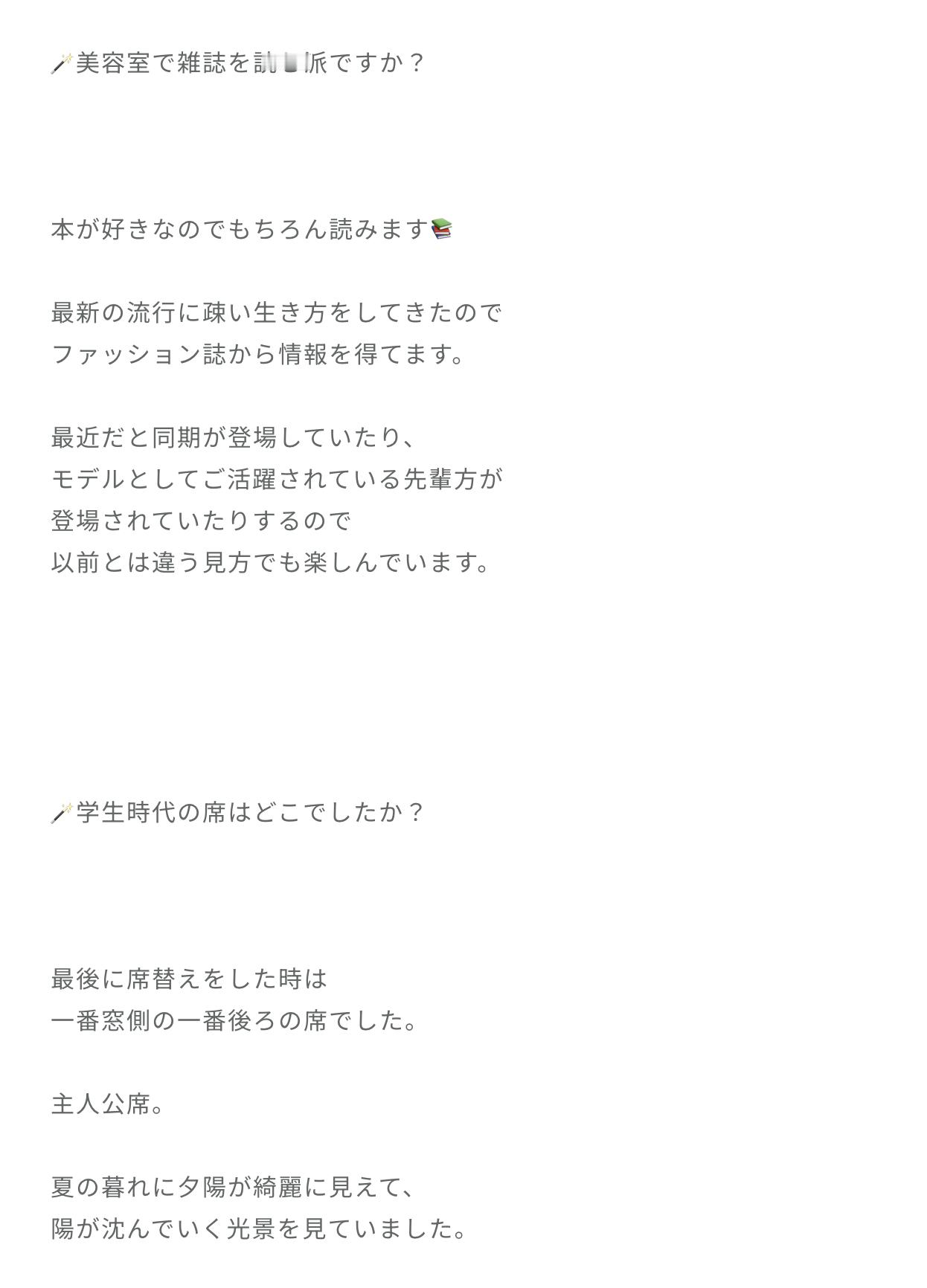 佐藤優羽「少しずつ、朝晩が涼しくなってきて、ようやく秋の訪れを感じます。日が落ちた時間帯にお散歩をしていると、建物の間に星が見えたことがあります。てっきり、東京は星が見えないところだという固定観念があったので驚きました。たくさんの光で溢れた場所で輝きを見せる星。みなさまにとって、そんな星のような存在になりたいです。」