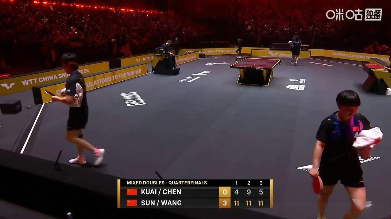 10月1日孙颖莎和王楚钦3—0陈垣宇和蒯曼观众席刘国梁个王励勤,秦志戬一起观看比